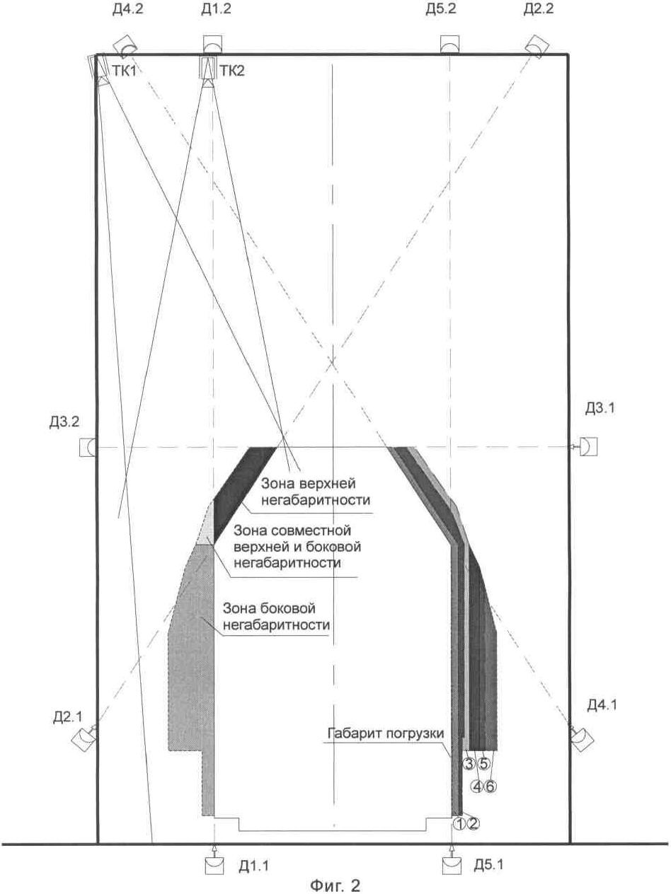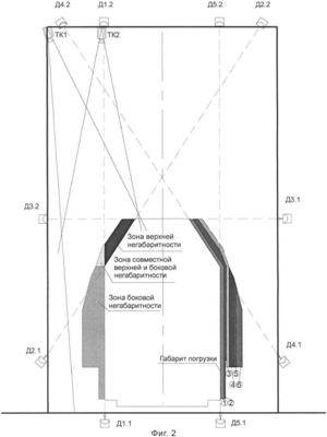 Задачей изобретения является обеспечение возможности оперативного обнаружения негабаритных грузов в вагонах на открытом подвижном составе, определение зон и степеней негабаритности грузов и установление их соответствия зонам и степеням негабаритности грузов, принятым при эксплуатации железных дорог.