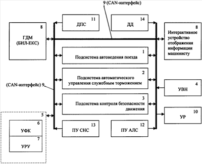 ЕКС включает подсистему автоведения поезда 1, в качестве которой может быть использована, например, унифицированная система УСАВП, подсистему автоматического управления служебным торможением 2, в качестве которой может быть использована, например, система САУТ-ЦМ, подсистему контроля безопасности движения 3, в качестве которой может быть использовано, например, локомотивное устройство КЛУБ-У, устройство выявления неисправностей (УВН) 4, интерактивное устройство интеллектуального контроля бодрствования машиниста 5, включающее узел физиологического контроля (УФК) 6, в качестве которого может быть использована, например, телемеханическая система контроля бодрствования машиниста (ТСКБМ), и узел регистрации управляющих действий машиниста по ведению поезда (УРУ) 7, два интерактивных устройства визуализации информации 8, по одному в каждой кабине машиниста, каждое из которых содержит цветной графический дисплей ГДМ и устройство отображения и безопасного ручного ввода ответственной информации БИЛ-ЕКС, общесистемный высокоскоростной CAN-интерфейс (CAN-250) 9, объединяющий все подсистемы, устройства и блоки системы ЕКС и обеспечивающий обмен между ними цифровой информации и передачу управляющих команд, устройство регистрации (УР) 10 в реальном времени всей цифровой информации, циркулирующей в CAN-интерфейсе, на энергонезависимый носитель УР. В качестве УР может быть использован, например, регистратор параметров движения поезда (РПДА). ЕКС также включает систему датчиков пути и скорости движения (ДПС) 11, приемное устройство автоматической локомотивной сигнализации (ПУ АЛС) 12, приемное устройство спутниковой навигационной системы (ПУ СНС) 13, систему датчиков давления (ДД) 14 в основных агрегатах пневматической тормозной системы локомотива.