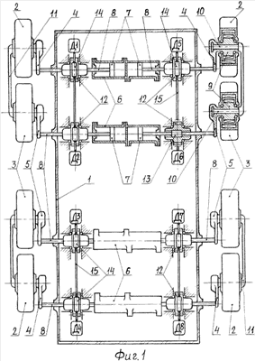 Кинематическая связь балансиров 4, 5 с колесами 2, 3 при помощи червячных передач 12, 14 позволяет осуществлять подъем или вращение любой пары тандемных колес 2, 3, или двух пар, или всех пар. Повышаются углы преодолеваемых подъемов, спусков, косогоров, обеспечивается высота корпуса 1, удобная для погрузки-выгрузки, переменный клиренс. Преодоление трудных участков пути (грязь, снег) возможно путем вращения любой пары тандемных балансиров 4, 5 с заторможенными колесами 2, 3 или попеременного вращения диагонально расположенных тандемных пар балансиров, или синхронного вращения всех балансиров 4, 5.