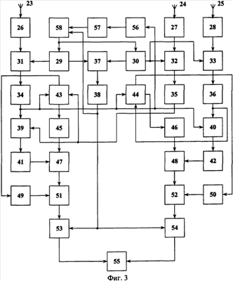 Регистрация сигнала бедствия осуществляется приемными антеннами 23-25. Указанные сигналы с выходов приемных антенн 23-25 через усилители 26-28 высокой частоты поступают на первые входы смесителей 31-33, на вторые входы которых подаются напряжения гетеродинов 29 и 30:
