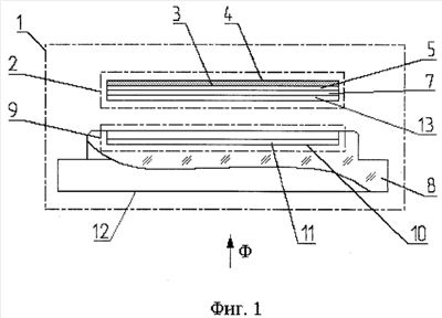 После этого основание 8 покрывают не пропускающей свет эмалью 5 цвета фона за исключением участка для установки листовой детали 2 и поверхности 12 входа светового потока Ф основания 8, затем листовую деталь 2 и основание 8 соединяют (например, оптически прозрачным сплошным клеевым швом 13) и проводят измерение значений цветовых координат совокупного светового потока и корректировку цветовых координат в листовой детали 2.