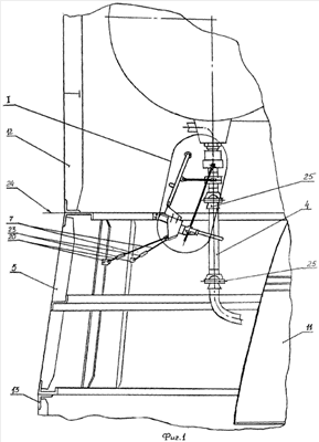 – опора 1, жестко закрепленная на нижнем переходнике 5 с помощью болтового соединения 6 и двух растягивающих тросов 7, регулируемых по длине с помощью регулировочных элементов 23, со сферическими шарнирами 8 и шарнирами 20 на концах, при этом верхняя часть опоры 3 ограничивает движение магистрали заправки и слива окислителя 4 в сторону нижнего переходника 5;