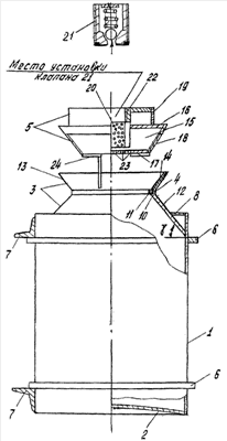 Крышка 5 выполнена в виде полого усеченного конуса 15 с верхним 16 и перфорированным нижним 17 основаниями с резьбой 18 на наружной поверхности образующих и жестко закрепленного на верхнем основании 16 цилиндрического хвостовика 19, снабженного по продольной оси съемным сорбционным фильтром 20 с предохранительным клапаном 21, ввертываемым по резьбе 22 в корпус хвостовика 19. Нижнее основание 17 крышки 5 снабжено сводообрушающей лопастью 24 в виде стержня, длина и форма которого выбирается из условий его эффективной работы.
