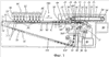 12. Устройство по п.9, отличающееся тем, что вспомогательная лента (10) проходит за пределы конца транспортерного узла (1) в направлении подачи, поддерживаемая с возможностью скольжения столом (66) и взаимодействующая с прижимной лентой (28), расположенной над указанным столом.