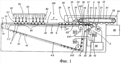 Лента 10, расположенная центрально относительно лент 4 и 5, образует петлю вокруг пяти шкивов 11, 12, 13, 14 и 15, объединенных для создания траектории, по которой совершает движение лента 10 вне периферийной границы спаренных лент 4 и 5 с возможностью прохождения над этими же самыми лентами, по меньшей мере вдоль ответвления указанной траектории Р, расположенного между прессом 80 и входом в узел 101.