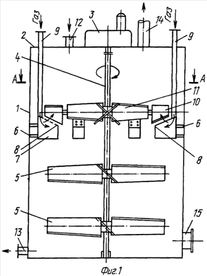 Каждая лопасть газодиспергирующего устройства состоит из двух жестко закрепленных между собой частей, одна из которых (концевая) 10 расположена непосредственно над перфорированными деками 8, а другая 11 – между валом 4 и газораспределителями 7. Карбонизатор имеет также патрубки для подвода и отвода жидкости 12, 13, отвода газа 14 и люк 15 для чистки и осмотра аппарата.
