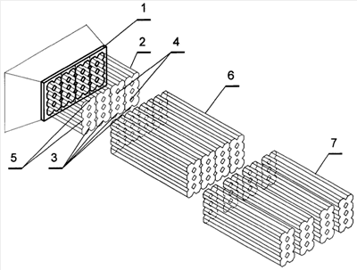 Согласно изображению на чертеже предварительно обработанную сырьевую глинистую массу продавливают через формообразующую решетку 1 с образованием сформированного сырца 2, состоящего из плотно прилегающих пустотелых брусьев 3 со сквозными отверстиями 4 и продольными пазами 5, равномерно распределенными по поверхности пустотелых брусьев 3. Посредством поперечной резки сформированного сырца 2 создают блоки 6 в виде плотно прилегающих пустотелых брусьев 3, при последующей раздвижке которых образуются блоки 7, состоящие из раздвинутых пустотелых брусьев 3.