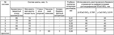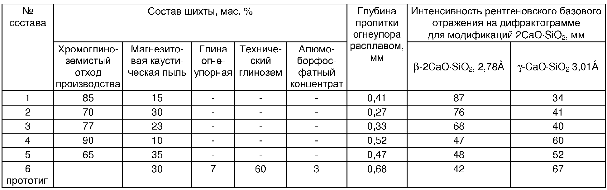 Хромсодержащие высокоглиноземистые отходы промышленности характеризуются следующим химическим составом, мас.%: Al2О3 – 68-84; Cr2O3 – 5-13; SiO2 – 0,5-13; MgO – 0,7-5; CaO – 0,3-13; Fe2О3 – 0,2-3; K2O+Na2O – 0,1-4. Содержащийся в отходах тугоплавкий оксид хрома является высокоэффективным стабилизатором Вышеперечисленное обеспечивает необходимое сочетание технологических характеристик и физико-химических и механических свойств нейтрализатора. Данный двухкомпонентный состав шихты позволяет уменьшить проникновение расплава в огнеупор и эффективно стабилизировать Нейтрализаторы металлургического шлака из предлагаемых шихт и шихты прототипа готовили по следующей технологии: хромоглиноземистый отход от выплавки хрома размалывали в шаровой мельнице до удельной поверхности выше 3500 см2/г и смешивали с магнезитовой каустической пылью до гомогенного состояния в соотношениях, указанных в таблице. Приготовленную шихту подавали на тарельчатый гранулятор и окатывали гранулы до размеров 10-40 мм. В качестве связки использовали раствор ЛСТ (лигносульфоната технического) плотностью 1,1-1,2 г/см3 в количестве 10-15% сверх 100% сухой шихты. Сформованные гранулы сушили при температуре 150-200°С. Для проведения лабораторных опытов по определению влияния хромсодержащих высокоглиноземистых отходов промышленности на степень стабилизации Смесь расплавляли в алундовом тигле при температуре 1600°С и в образовавшийся расплав помещали на 1 час образцы размером 20×20×40 мм, выпиленные из периклазоуглеродистого кирпича марки ПУСК по ТУ 14-200-336-98. Проникновение расплава в огнеупор определяли по глубине пропитки огнеупорных образцов по толщине измененной зоны, для чего образцы извлекали из расплава и на полированном срезе измеряли толщину пропитанной зоны. Для оценки эффекта стабилизации Результаты выполненных работ также приведены в таблице. Анализ полученных данных позволяет сделать следующие выводы: 1. Составы шихт нейтрализатора шлака 2. Увеличение содержания хромсодержащего высокоглиноземистого отхода промышленности в шихте нейтрализатора свыше заявленных (состав Уменьшение ввода упомянутого отхода ниже предложенного диапазона до 65% (состав Таким образом, предлагаемая шихта для изготовления нейтрализатора шлака, отличительным признаком которой является введение в ее состав хромсодержащих высокоглиноземистых отходов промышленности в качестве глиноземистого компонента и одновременно добавки, стабилизирующей Важным преимуществом предлагаемой шихты для приготовления нейтрализатора является использование побочных продуктов производства взамен промышленно выпускаемых материалов. Шихта для изготовления нейтрализатора шлака проверена в промышленных условиях с положительным результатом и рекомендуется для использования в производстве.