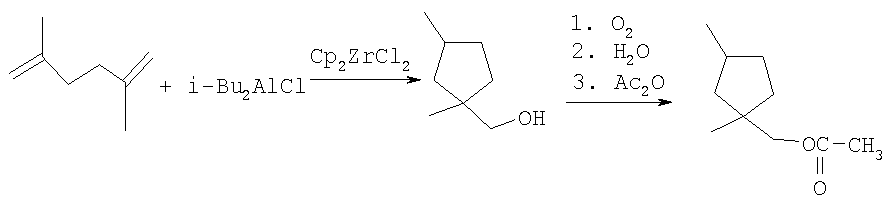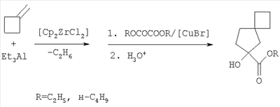 R=CH2H5, н-C4H9, Циклоалканолы со сложноэфирными заместителями могут найти применение в тонком органическом синтезе, в частности при получении спиро[3.4]окта-5,7-диена ([1] I.Erden, E.M.Sorenson, A convenient synthesis of spiro[3.4]oct-5,7-diene, Tet.Lett., v.27, 1983, 2731-2732) и диспиро[2.1.3.2.]декана ([2] J.E.Baldwin and R.Shukla, Two synthesis of dispiro[2.1.3.2.]decane, Org.Lett, 1999, v.1, Известен способ ([5], Джемилев У.М., Ибрагимов А.Г., Вострикова О.С., Васильева Е.В., Толстиков Г.А. Катализируемое комплексами циркония региоселективное гидроалюминирование непредельных углеводородов алкилаланами Изв. АН СССР. Сер. хим., 1987, с.1089) получения (1,3-диметилциклопентил)метилацетата взаимодействием 2,5-диметил-1,5-гексадиена с ди(изобутил)алюминийхлоридом (i-Bu2AlCl) в присутствии катализатора Cp2ZrCl2 с последующим окислением реакционной массы с помощью кислорода, затем гидролизом и обработкой после выделения образующегося диметилциклопентилметилового спирта с помощью уксусного ангидрида по схеме: Известным способом не могут быть получены 6-гидроксиспиро[3,4]октан-6-алкилкарбоксилаты общей формулы (1). Известен способ ([6], Джемилев У.М., Ибрагимов А.Г., Вострикова О.С., Васильева Е.В., Толстиков Г.А. Катализируемое комплексами циркония региоселективное гидроалюминирование непредельных углеводородов алкилаланами Изв. АН СССР. Сер. хим., 1987, с.1089) получения (циклопентил)метилацетата взаимодействием 1,5-гексадиена с ди(изобутил)алюминийхлоридом в присутствии катализатора Cp2ZrCl2 с последующим окислением реакционной массы с помощью кислорода, затем гидролизом и обработкой образующегося циклопентилметилового спирта с помощью уксусного ангидрида по схеме: Известный способ не позволяет получать 6-гидроксиспиро[3,4]октан-6-алкилкарбоксилаты общей формулы (1). Предлагается новый способ получения 6-гидроксиспиро[3,4]октан-6-алкилкарбоксилатов общей формулы (1). Сущность способа заключается во взаимодействии метиленциклобутана с триэтилалюминием (AlEts) в присутствии катализатора цирконацендихлорида (Cp2ZrCl2), взятыми в мольном соотношении метиленциклобутан:AlEt3:Ср2ZrCl2=10:(12-16):(0.5-0.9), предпочтительно 10:14:0.7, в атмосфере аргона при комнатной температуре (20-21°С) и атмосферном давлении в алифатическом растворителе (гексан) в течение 4 часов, с последующим добавлением к реащионной массе при температуре -15°С катализатора бромида меди (CuBr) в количестве 10-14 мол.% по отношению к метиленциклобутану, предпочтительно 12 мол.%, и диалкилового эфира щавелевой кислоты (ROCOCOOR, где R=С2Н5, н-С4Н9), взятого в трехкратном избытке по отношению к AlEt3, с последующим перемешиванием реакционной массы при комнатной температуре (20-21°С) в течение 8-10 часов, предпочтительно 9 часов. Общий выход 6-гидроксиспиро[3,4]октан-6-алкилкарбоксилатов (1) составляет после кислотного гидролиза реакционной массы 76-95%. Реакция протекает по схеме: 6-Гидроксиспиро[3,4]октан-6-алкилкарбоксилаты (1) образуются только лишь с участием AlEt3, метиленциклобутана, диалкилоксалатов и катализаторов Cp2ZrCl2 и CuBr. В присутствии других соединений алюминия (например, Bu2 Проведение указанной реакции в присутствии катализатора Cp2ZrCl2 больше 9 мол.% или CuBr больше 14 мол.% по отношению к метиленциклобутану не приводит к существенному увеличению выхода целевых продуктов (1). Использование катализатора Cp2ZrCl2 менее 5 мол.% и CuBr менее 10 мол.% по отношению к метиленциклобутану снижает выход 6-гидроксиспиро[3,4]октан-6-алкилкарбоксилатов (1), что связано, воз
