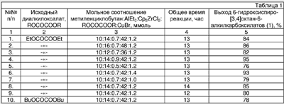 R=CH2H5, н-C4H9, в котором метиленциклобутан подвергают взаимодействию с триэтилалюминием (AlEt3) в присутствии катализатора цирконацендихлорида Cp2ZrCl2 при мольном соотношении метиленциклобутан: AlEt3:Ср2ZrC12=10:(12-16):(0,5-0,9), в атмосфере аргона при комнатной температуре и атмосферном давлении в гексане в течение 4 часов, с последующим добавлением к реакционной массе при температуре -15°С катализатора бромида меди (CuBr) в количестве 10-14 мол.% по отношению к метиленциклобутану и диалкилового эфира щавелевой кислоты, взятого в трехкратном избытке по отношению к AlEt3, после чего реакционную массу перемешивают при комнатной температуре с последующим кислотным гидролизом реакционной массы. 6-Гидроксиспиро[3,4]октан-6- алкилкарбоксилаты могут найти применение в тонком органическом синтезе, производстве лакокрасочных материалов, биологически активных веществ. Общий выход конечного продукта после гидролиза реакционной массы составляет 76-95%., 1 табл.