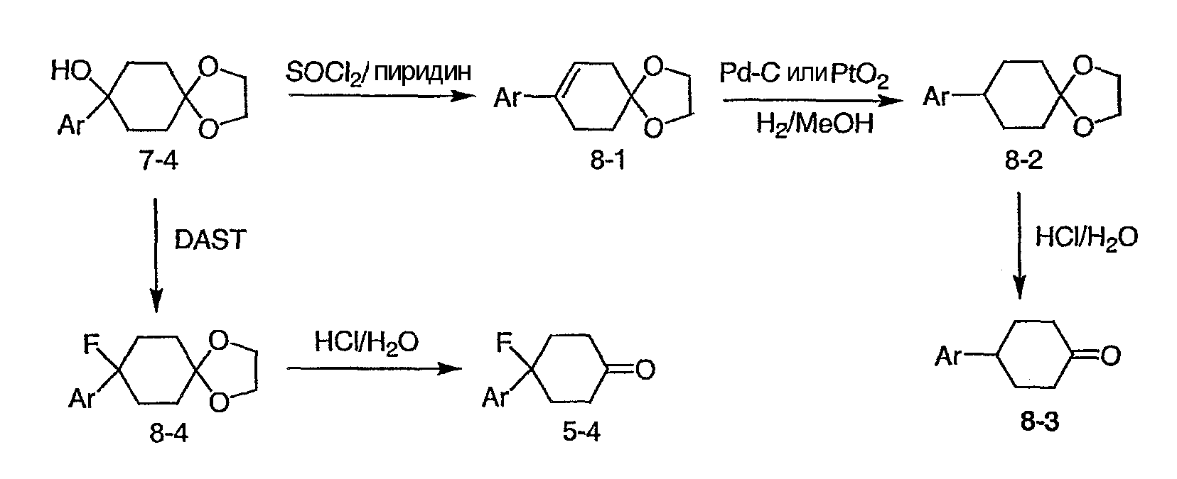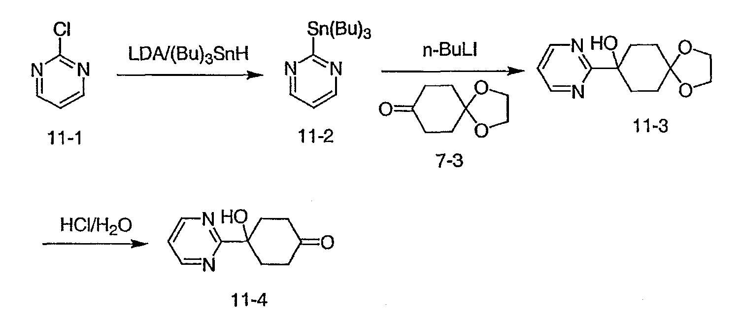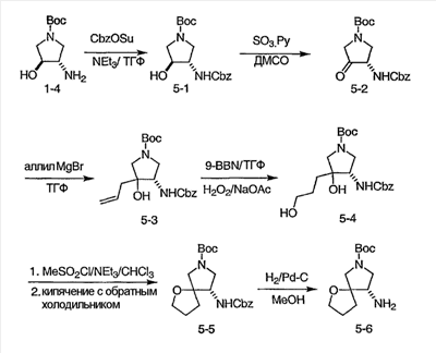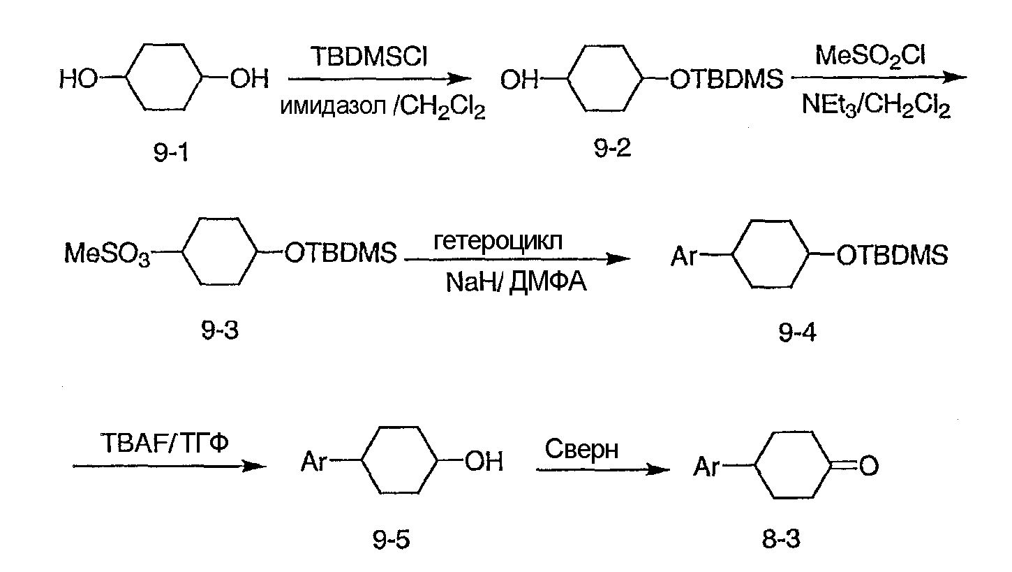 Раствор 3-бромпиридина (1,13 г, 7,13 ммоль) растворяют в сухом эфире в атмосфере азота, охлаждают до -78°C и затем по каплям добавляют н-бутиллитий (4,50 мл, 7,13 ммоль, 1,6М в гексане). Через 30 минут по каплям добавляют раствор 5H-спиро[бицикло[2.2.2]октан-2,2′-[1,3]диоксолан]-5-она (0,65 г, 3,56 ммоль, J. Org. Chem. 1991, 56, 1052-1058) в эфире и полученную смесь перемешивают в течение двух часов при -78°C. Смесь затем нагревают до 0°C и разбавляют этилацетатом. Органический экстракт промывают NaHCO3/H2O и насыщенным раствором соли и затем сушат над MgSO4, фильтруют и концентрируют. Остаток подвергают хроматографии на силикагеле, используя этилацетат в качестве элюента, получая два изомерных продукта в виде белого твердого вещества: продукт с более высоким Rf, 0,294 г (32%); продукт с более низким Rf, 0,220 г (24%). Продукт с более высоким Rf: 1ЯМР (CDCl3) : 8,87 (с, 1H), 8,49 (д, 1H), 7,91 (дт, 1H), 7,27 (м, 1H), 3,92 (м, 4H), 2,69 (дт, 1Н), 2,20 (м, 1H), 1,85-2,15 (м, 3H), 1,60-1,83 (м, 4H), 1,50 (м, 1Н). Продукт с более низким Rf: 1ЯМР (CDCl3) : 8,80 (с, 1H), 8,50 (д, 1H), 7,86 (дт, 1H), 7,29 (м, 1H), 3,90-4,10 (м, 4H), 2,44 (дт, 1H), 2,33 (дд, 1H), 2,15-2,27 (м, 2Н), 2,00 (м, 1H), 1,75-1,88 (м, 2H), 1,70 (м, 1H), 1,51 (м, 2H), 1,34 (м, 1H).
