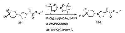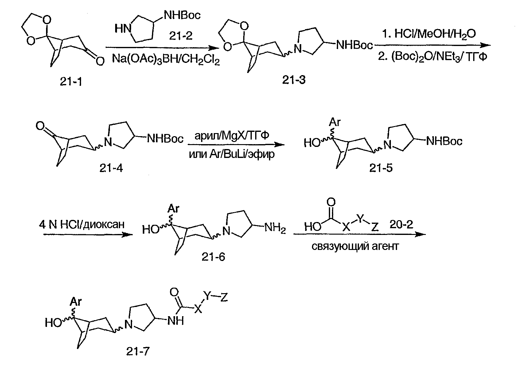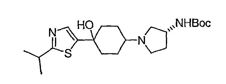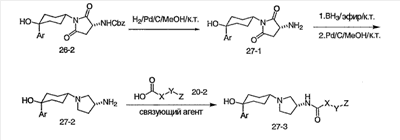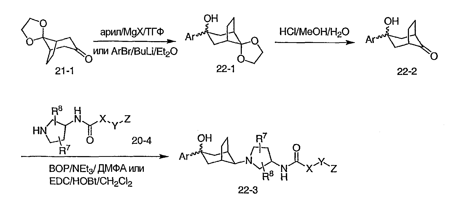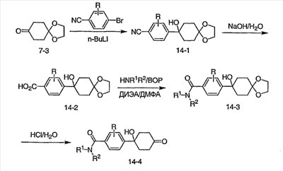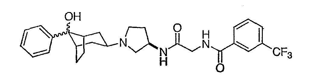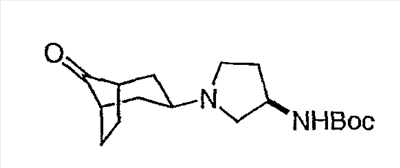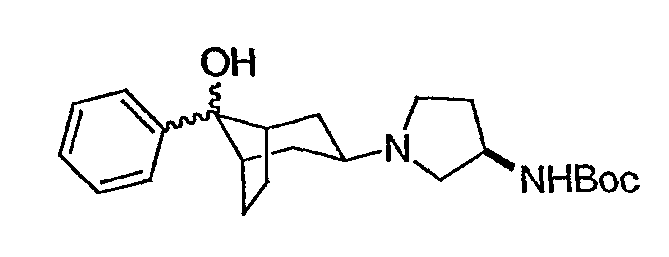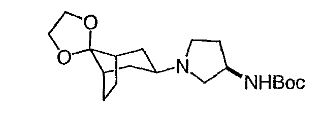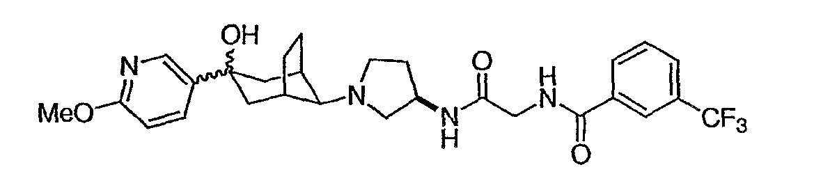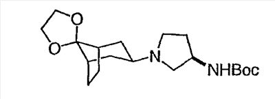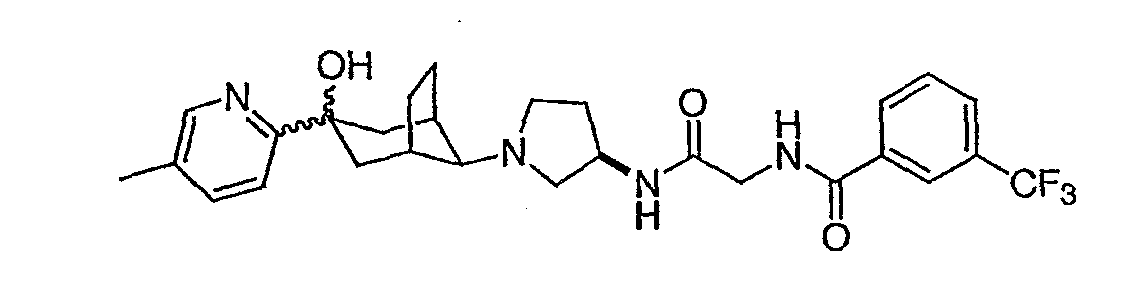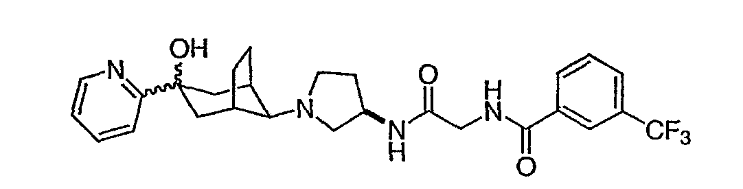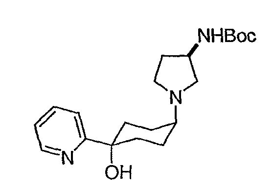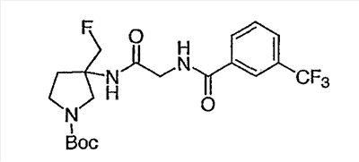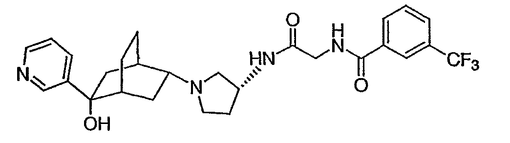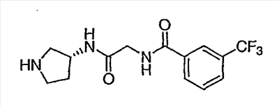 Гидрохлорид N-{2-оксо-2-[(3R)-пирролидин-3-иламино]этил}-3-(трифторметил)бензамида (100 мг, 0,284 ммоль) и 5-гидрокси-5-пиридин-3-илбицикло[2.2.2]октан-2-он (62,0 мг, 0,284 ммоль) растворяют в сухом ТГФ (10 мл). Добавляют триэтиламин (80 мкл, 0,57 ммоль) и триацетоксиборгидрид натрия (120 мг, 0,57 ммоль) и смесь перемешивают при комнатной температуре в течение ночи. По данным ТСХ происходит превращение в нужные продукты в соотношении изомеров примерно 1:1. Адсорбируют реакционную смесь на силикагеле и подвергают хроматографии, элюируя дихлорметаном до смеси 10% метанол/дихлорметан/0,5% гидроксид аммония. Фракции объединяют, получая чистый изомер с более высоким Rf и чистый изомер с более низким Rf. Продукт с более высоким Rf: ЖХ/МС (положительный ион) m/z=517,1 (M+H)+; продукт с более низким Rf: ЖХ/МС (положительный ион) m/z=517,2 (M+H)+.