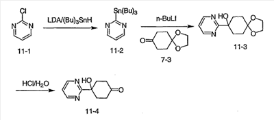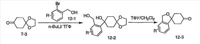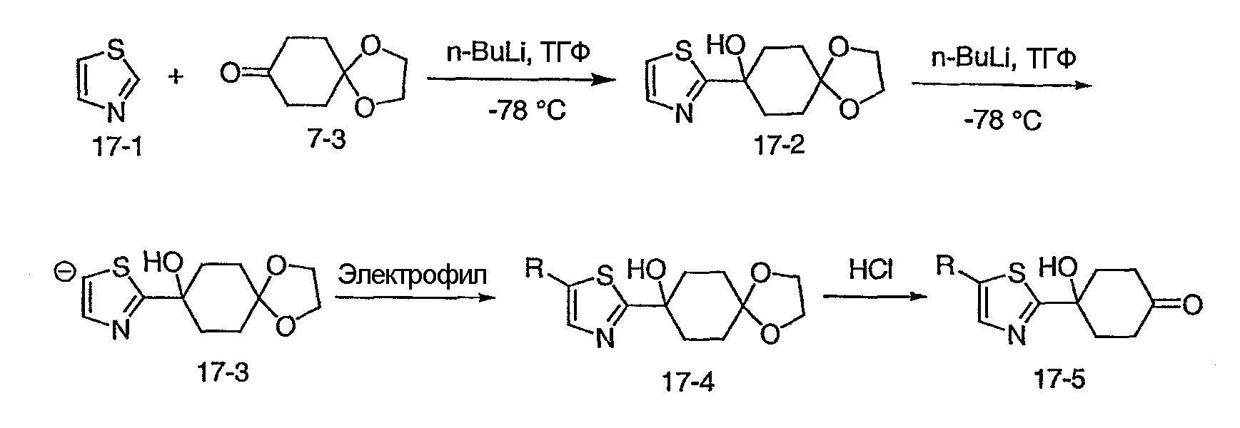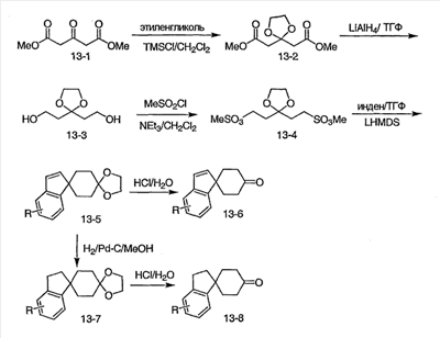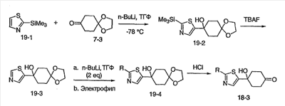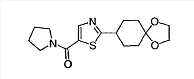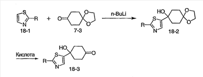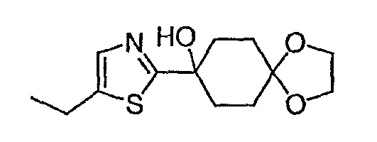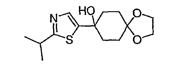 При -78°C, 1,5М н-бутиллитий в гексане (6,7 мл) медленно добавляют к раствору 3-метилизотиазола (1,0 г, 0,010 моль) в тетрагидрофуране (15 мл) в течение 20 минут. После перемешивания в течение еще 30 минут, в течение 10 минут добавляют l,4-диоксаспиро[4,5]декан-8-он (1,56 г, 0,00999 моль) в тетрагидрофуране (5 мл). Реакционную смесь перемешивают еще в течение 2 часов при -78°C и оставляют нагреваться в течение ночи до комнатной температуры. После того как смесь гасят насыщенным раствором соли, смесь экстрагируют EtOAc. Органический слой сушат и концентрируют. В результате хроматографии на силикагеле, элюируя смесью гексан/EtOAc (1:5~1:1), получают 1,8 г (70,6%) указанного в заголовке соединения. МС (М+H)+ 256.