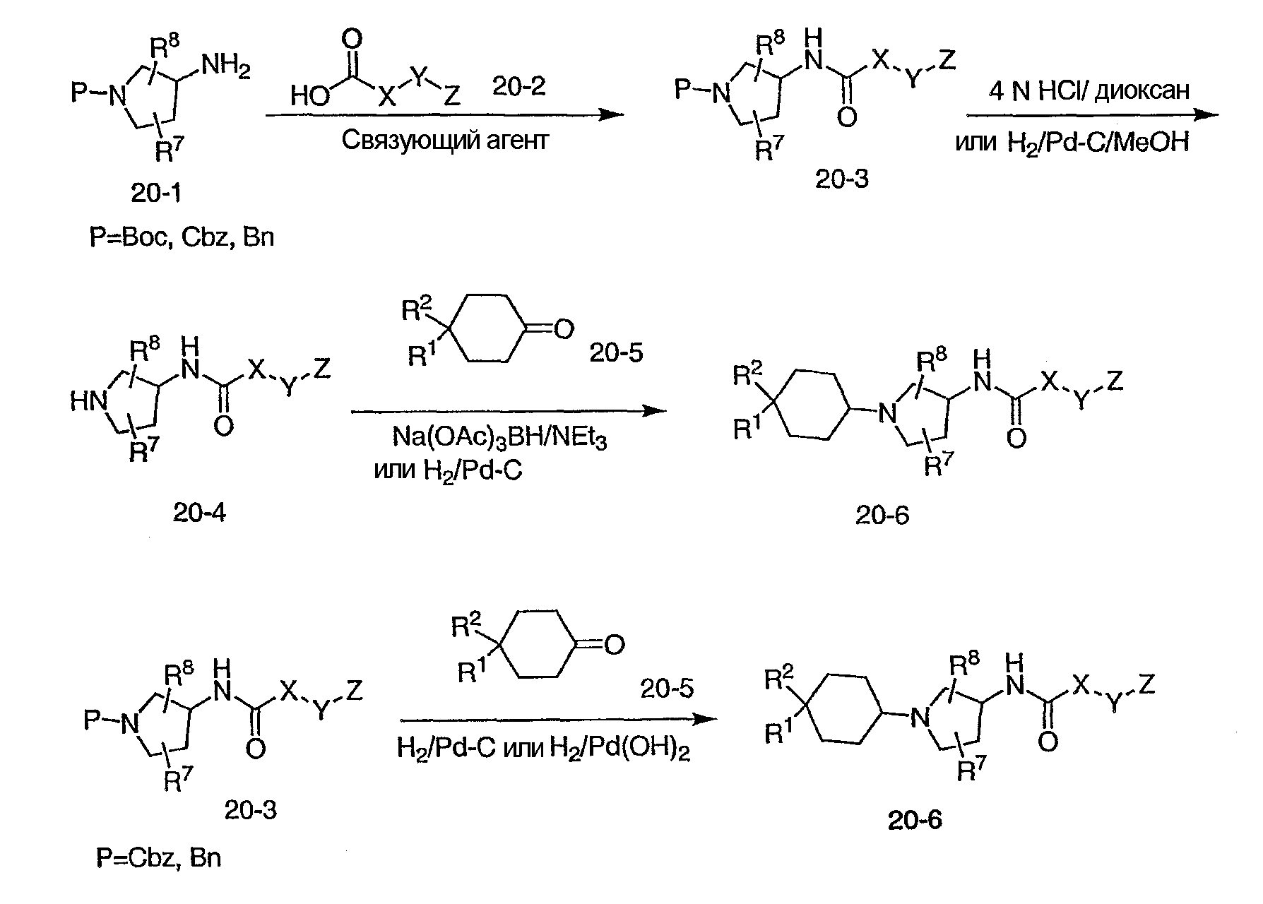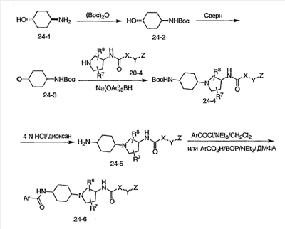 Настоящее изобретение относится к модуляторам рецепторов хемокинов, например антагонистам, и к их применению в качестве лекарственных агентов. Настоящее изобретение, кроме того, относится к новым соединениям и медицинским способам лечения воспалений и других заболеваний, особенно таких, которые связаны с накоплением лимфоцитов или моноцитов, которое наблюдается при ревматоидном артрите, волчанке, заболевании трансплантат против хозяина и/или при отторжении трансплантатов. Более конкретно, настоящее изобретение относится производным 3-аминопирролидина и к их применению в качестве модуляторов рецепторов хемокинов.