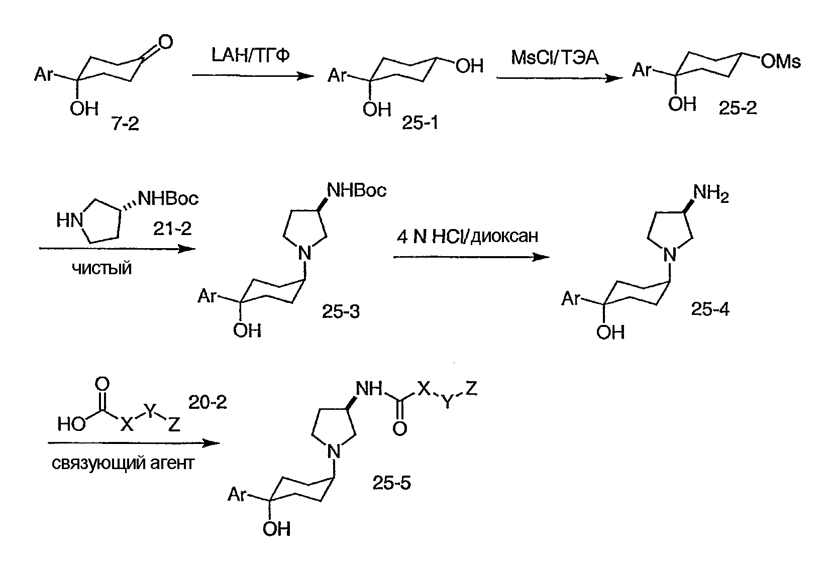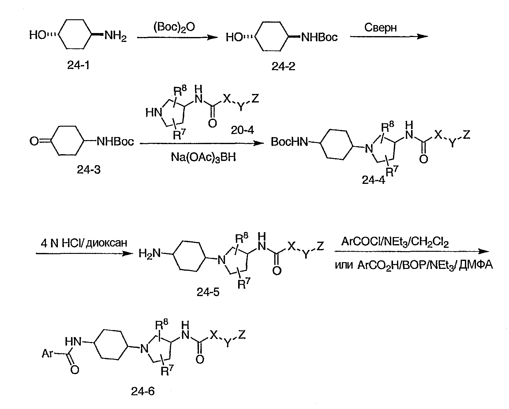 Соответственно, лекарственные средства, которые ингибировали бы связывание хемокинов, таких как MCP-1 и/или MIP-1 , с этими рецепторами, например антагонисты рецепторов хемокинов, могли бы быть полезны в качестве фармацевтических агентов, которые ингибировали бы воздействие хемокинов, таких как MCP-1 и/или MIP-1 , на клетки-мишени, но в предшествующем уровне техники нет указаний относительно производных 3-аминопирролидина, которые обладают такими фармакологическими свойствами. Обнаружение соединений, которые модулируют функции CCR2 и/или CCR5, представляет превосходный подход к созданию лекарственных средств для разработки фармакологических агентов для лечения воспалительных состояний и заболеваний, связанных с активацией CCR2 и/или CCR5, таких как ревматоидный артрит, волчанка и другие воспалительные заболевания. Настоящее изобретение преодолевает длительную потребность в области модуляторов и антагонистов рецепторов хемокинов.