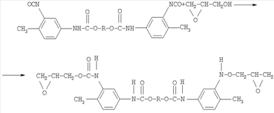 Способ получения полиглицидилазида, модифицированного тетрагидрофураном, с концевыми эпоксидными группами, заключающийся в том, что полиглицидилазид, модифицированный тетрагидрофураном, подвергают взаимодействию с избыточным количеством 1,6-гександиизоцианата или 2,4-толуилендиизоцианата при температуре 55±5°С в течение 7 ч с образованием форполимера с концевыми изоцианатными группами, определяют содержание гидроксильных групп, этерифицируют глицидолом при температуре 60±5°С в течение 5 ч, определяют содержание изоцианатных групп, вакуумируют при температуре 65±5°С и остаточном давлении 2-3 мм рт.ст. и определяют содержание эпоксидных групп.