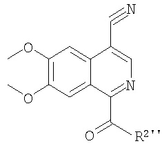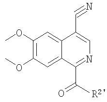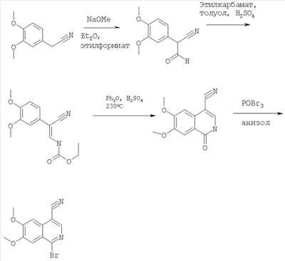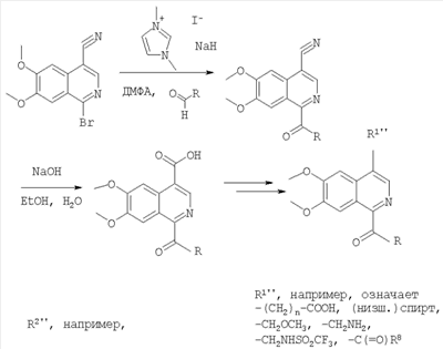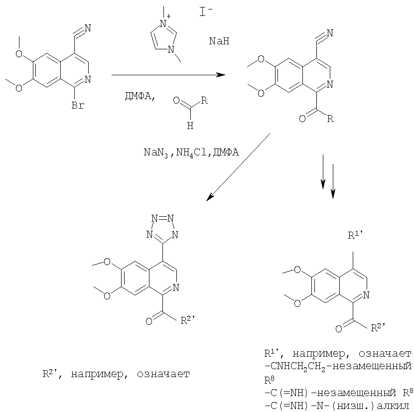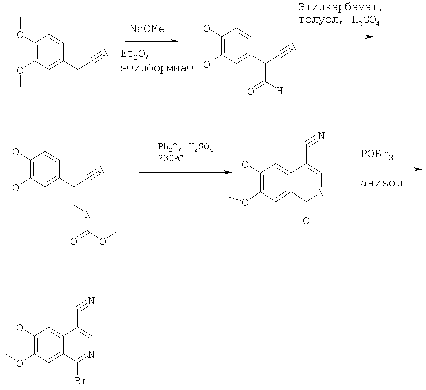 В смесь гомовератронитрила (17,7 г, 0,1 моля) и метоксида натрия (7,7 г, 0,11 моля) в эфире (300 мл) добавляли этилформиат натрия (8,2 мл) в эфире (100 мл) и полученную смесь интенсивно перемешивали в течение 3 сут. Твердый осадок отфильтровывали, промывали эфиром и растворяли в воде (100 мл), подкисляли 10% уксусной кислотой до рН 3. Полученный осадок собирали фильтрованием, промывали водой и сушили, при этом получали 2-(3,4-диметоксифенил)-3-оксопропионитрил (19 г, 93%) в виде твердого вещества белого цвета. МС-ЖХ: (m/е) рассч. для С11Н11NO3 206 (МН+), найд. 206. В смесь 2-(3,4-диметоксифенил)-3-оксопропионитрила (20,5 г, 0,1 моля) и уретана (8,9 г, 0,1 моля) в толуоле (400 мл) добавляли конц. серную кислоту (0,5 мл, 10 ммолей). Смесь кипятили с обратным холодильником и концентрировали упариванием при слабом кипячении до объема приблизительно 50 мл. Охлажденную смесь фильтровали, осадок промывали бензолом и сушили. После очистки экспресс-хроматографией (силикагель 60 фирмы Merck, 70-230 меш, элюент: 20% хлористый метилен) получали этиловый эфир [2-циано-2-(3,4-диметоксифенил)винил]карбаминовой кислоты в виде твердого вещества. МС-ЖХ: (m/е) рассч. для C14H16N2O4 277 (МН+), найд. 277. 1Н-ЯМР (300 МГц): соответствует структуре соединения. Конц. серную кислоту (0,4 мл) добавляли в смесь этилового эфира [2-циано-2-(3,4-диметоксифенил)винил]карбаминовой кислоты (33,5 г, 121 ммоль) и дифенилового эфира (230 мл). Полученную смесь нагревали при 230°С в течение 6 ч. После охлаждения и добавления эфира образовывался осадок в виде твердого вещества, который собирали фильтрованием, промывали эфиром и сушили, при этом получали 6,7-диметокси-1-оксо-1,2-дигидроизохинолин-4-карбонитрил (20,7 г, 74,1%) в виде твердого вещества коричневого цвета, который использовали без дополнительной очистки. МС-ЖХ: (m/е) рассч. для C12H10N2O3 231 (МН+), найд. 231. Смесь 6,7-диметокси-1-оксо-1,2-дигидроизохинолин-4-карбонитрила (8 г, 35 ммолей) и оксибромида фосфора (70 г, 244 ммоля) в анизоле (30 мл) нагревали при 80°С в течение 12 ч. Растворитель и избыток POBr3 удаляли на роторном испарителе. Полученное твердое вещество промывали гексаном и сушили, затем медленно добавляли в лед и полученный продукт экстрагировали хлороформом. Органический слой промывали насыщенным водным раствором карбоната натрия, насыщенным водным раствором хлорида натрия (20 мл), сушили над сульфатом магния, фильтровали и концентрировали в вакууме, при этом получали твердое вещество коричневого цвета. После очистки экспресс-хроматографией (силикагель 60 фирмы Merck, 70-230 меш, элюент: хлористый метилен) получали 1-бром-6,7-диметоксиизохинолин-4-карбонитрил (7,5 г, 75%) в виде твердого вещества коричневого цвета. МС-ЖХ: (m/е) рассч. для C12H9BrN2O2 293 (МН+), найд. 293. В смесь 1-бром-6,7-диметоксиизохинолин-4-карбонитрила (50 мг, 0,17 ммоля), 2-нафтальдегида (40,6 мг, 0,26 ммоля) и иодида 1,3-диметилимидазолия (16 мг, 0,26 ммоля) в ДМФА (2 мл) добавляли гидрид натрия (11 мг, 0,26 ммоля). Полученная смесь приобретала темную окраску. Через 1 ч добавляли воду (4 мл) и раствор экстрагировали хлороформом (6 мл). Экстракт промывали водой (4 мл), сушили над сульфатом натрия, фильтровали и концентрировали в вакууме, при этом получали твердое вещество, которое использовали без дополнительной очистки. Смесь полученного выше твердого вещества (0,17 ммоля), азида натрия (34 мг, 0,51 ммоля) и хлорида аммония (27 мг, 0,51 ммоля) в ДМФА (2 мл) перемешивали при 100°С в течение 24 ч. После удаления растворителя неочище