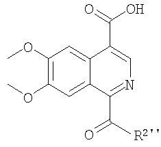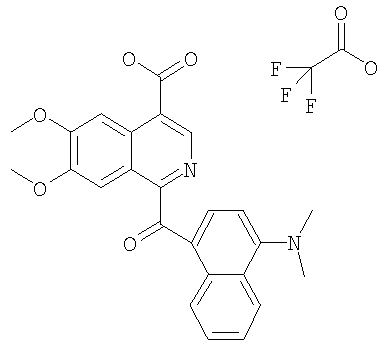 В смесь 1-бром-6,7-диметоксиизохинолин-4-карбонитрила (см. пример 1, 50 мг, 0,17 ммоля), 4-диметиламино-1-нафтальдегида (51,8 мг, 0,26 ммоля) и иодида 1,3-диметилимидазолия (16 мг, 0,26 ммоля) в ДМФА (2 мл) добавляли гидрид натрия (11 мг, 0,26 ммоля). Полученная реакционная смесь приобретала темную окраску. Через 1 ч к полученной смеси добавляли воду (4 мл) и раствор экстрагировали хлороформом (6 мл). Экстракт промывали водой (4 мл), сушили над сульфатом натрия, фильтровали и концентрировали в вакууме, при этом получали твердое вещество. После очистки экспресс-хроматографией (силикагель 60 фирмы Merck, 70-230 меш, элюент: 0-40% EtOAc в хлористом метилене в течение 30 мин) получали 1-(4-диметиламинонафталин-1-карбонил)-6,7-диметоксиизохинолин-4-карбонитрил (31 мг, 41%) в виде твердого вещества белого цвета. МС-ЖХ: (m/е) рассч. для C21H18N2O5 379 (МН+), найд. 379. В суспензию 1-(4-диметиламинонафталин-1-карбонил)-6,7-диметоксиизохинолин-4-карбонитрила (31 мг, 0,082 ммоля) в метаноле (2 мл) добавляли 25% водный раствор гидроксида натрия (0,27 мл, 1,68 ммоля). Полученную смесь перемешивали при 90°С в течение 12 ч. После охлаждения до комнатной температуры реакционную смесь подкисляли до рН 2 добавлением 2 н. раствора НС1. Продукт экстрагировали хлороформом (2×200 мл). Объединенные органические слои промывали водой (3×50 мл), сушили над сульфатом натрия, фильтровали и концентрировали в вакууме. Неочищенный продукт очищали обращенно-фазовой ЖХВР (С18, элюент: 10%-90% ацетонитрил в воде в течение 10 мин), при этом получали требуемый продукт 1-(4-диметиламинонафталин-1-карбонил)-6,7-диметоксиизохинолин-4-карбоновую кислоту (9 мг) в виде твердого вещества. МС-ЖХ: (m/е) рассч. для C25H22N2O5 431 (МН+), найд. 431. Пример 13 Трифторацетат 1-(4-метоксинафталин-1-карбонил)-6,7-диметоксиизохинолин-4-карбоновой кислоты