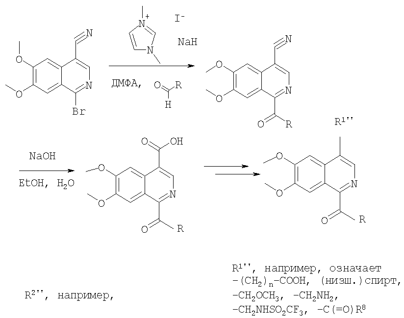 а R4” означает Н, ОСН3 или N(CH3)2. Предпочтительными также являются соединения формулы I, полученные вышеописанным способом. Соединения формулы I предпочтительно используют в качестве терапевтически активных веществ. Для получения лекарственных средств, предназначенных для профилактики и лечения диабета типа II, предпочтительно используют соединения формулы I. Другим предпочтительным аспектом настоящего изобретения являются фармацевтические композиции, содержащие соединения формулы I, и терапевтически инертный носитель. Предпочтительным также является применение соединения формулы I для получения лекарственных средств, предназначенных для лечения и профилактики диабета типа II. Предпочтительным является также способ лечения диабета типа II у пациентов, нуждающихся в таком лечении, включающий введение пациенту терапевтически эффективного количества соединения формулы I или его фармацевтически приемлемой соли, в количестве от приблизительно 10 мг до приблизительно 1000 мг в сут. Соединения по настоящему изобретению получают, как указано или по известным методикам. Общая схема синтеза Схема 1 Схема 2