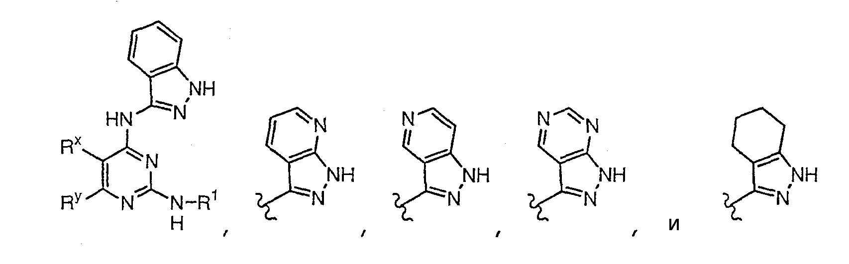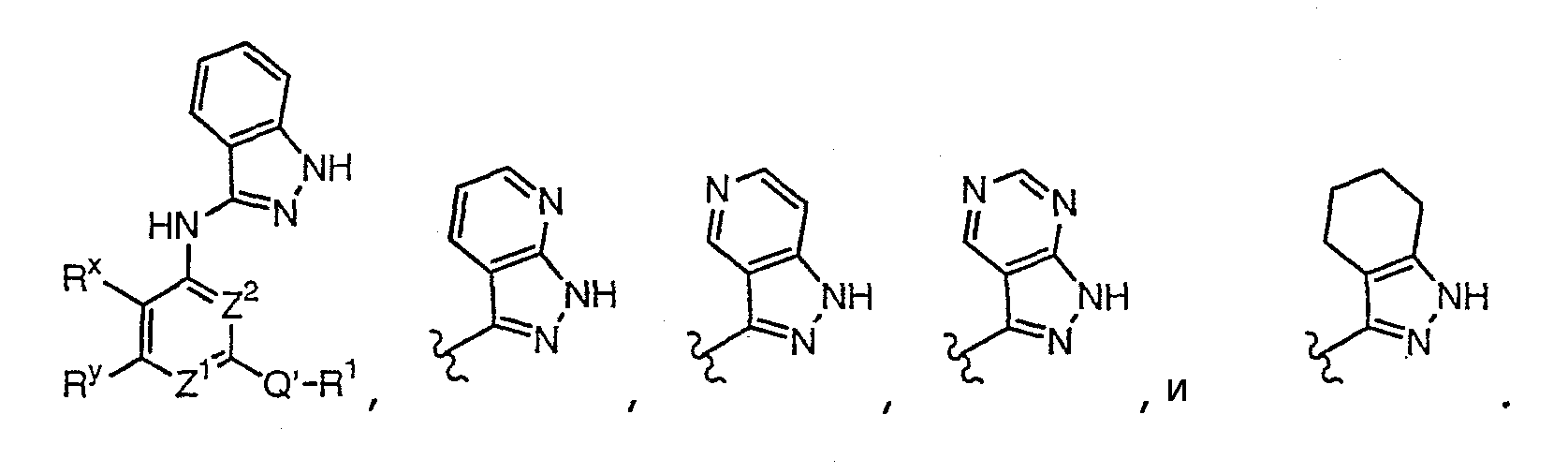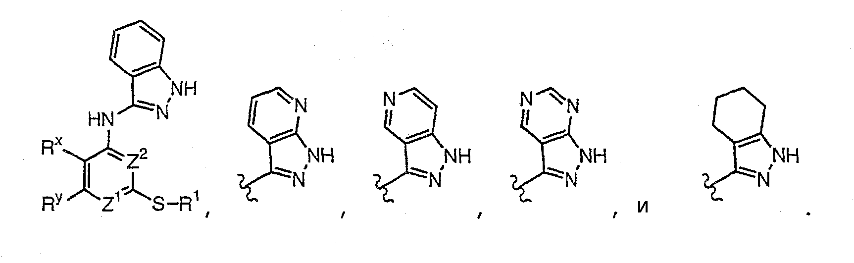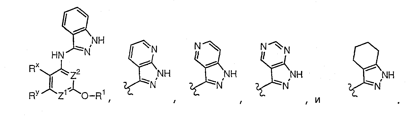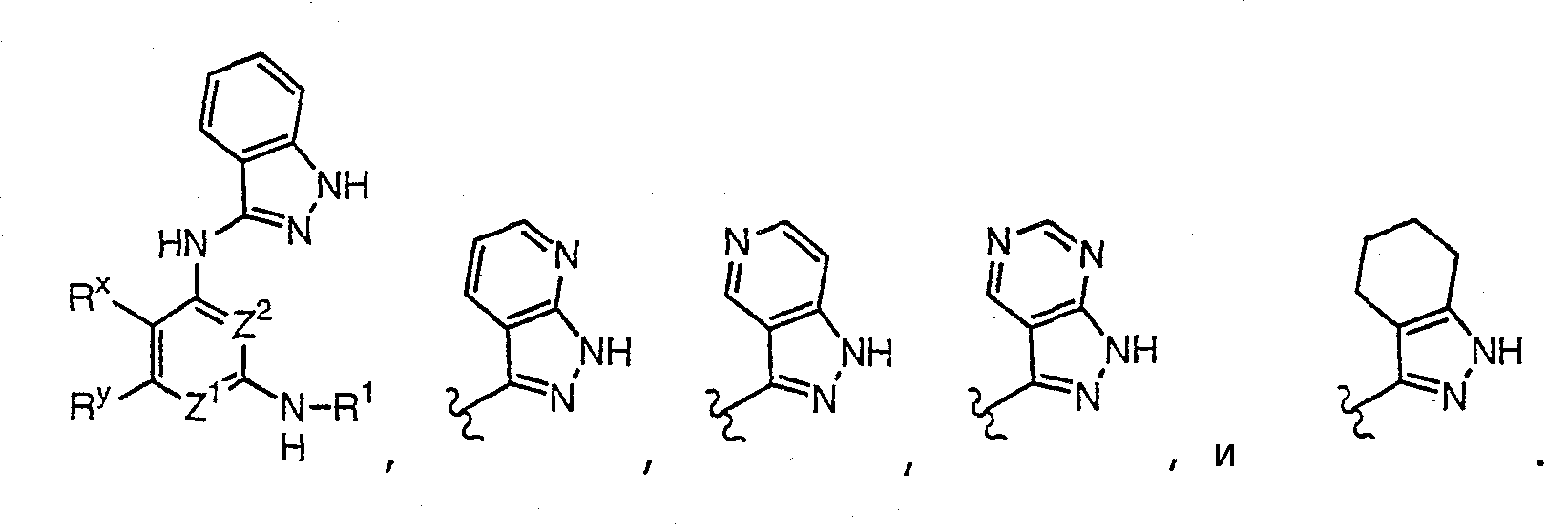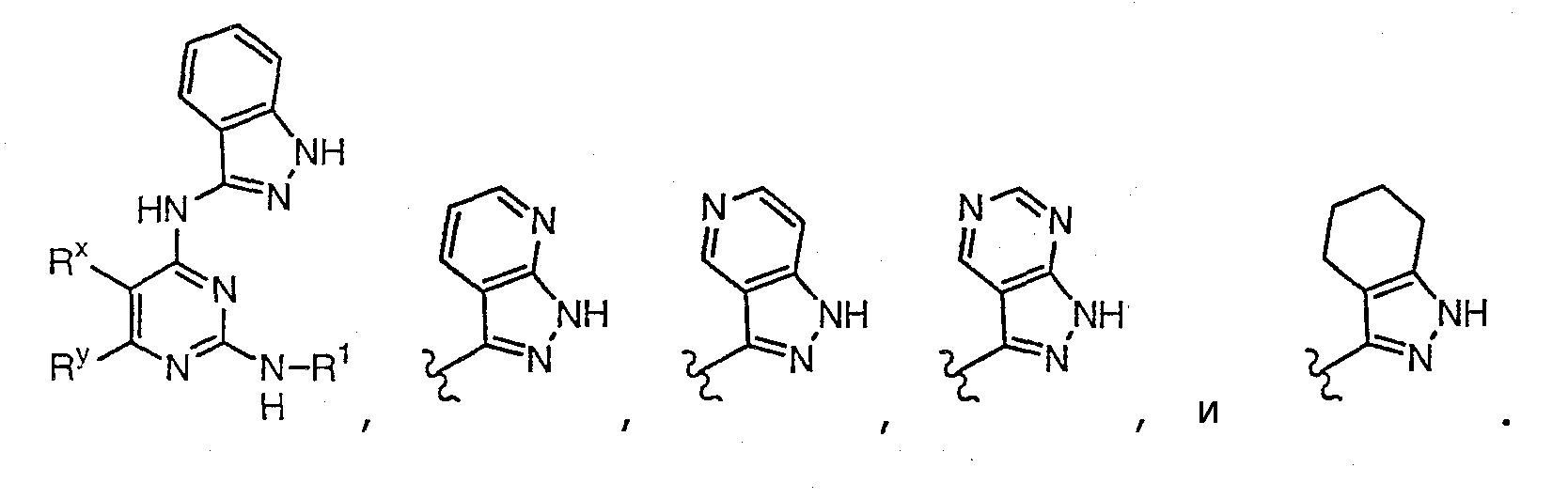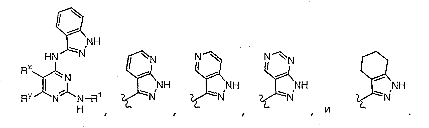 ПЕРЕКРЕСТНАЯ ССЫЛКА НА РОДСТВЕННЫЕ ЗАЯВКИ Данная заявка притязает на приоритет по предварительной заявке на патент США 60/257887, поданной 21 декабря 2000 г., и предварительной заявке на патент США 60/286949, поданной 27 апреля 2001 г., содержания которых включены в данное описание в виде ссылки. ОБЛАСТЬ ТЕХНИКИ, К КОТОРОЙ ОТНОСИТСЯ ИЗОБРЕТЕНИЕ Настоящее изобретение относится к области медицинской химии и касается соединений, которые являются ингибиторами протеинкиназы, композиций, содержащих такие соединения, и способов их применения. В частности, настоящее изобретение относится к соединениям, которые являются ингибиторами протеинкиназы Aurora-2. Изобретение касается также способов лечения связанных с указанными протеинкиназами заболеваний, в частности заболеваний, связанных с Aurora-2, таких как рак. ПРЕДПОСЫЛКИ СОЗДАНИЯ ИЗОБРЕТЕНИЯ Поиску новых терапевтических средств в последнее время в значительной степени способствовало лучшее понимание структуры ферментов и других биомолекул, связанных с определенными заболеваниями. Важным классом ферментов, являющихся предметом широких исследований, являются протеинкиназы. Протеинкиназы служат посредниками внутриклеточного преобразования сигналов. Осуществляют они это путем переноса фосфорила от нуклеозидтрифосфата к акцептору белков, входящему в путь передачи сигналов. Существует много киназ и путей, посредством которых внеклеточные и другие раздражители вызывают разнообразные клеточные ответные реакции, имеющие место в клетке. Примеры таких раздражителей включают сигналы окружающей среды и химического напряжения (например, осмотический удар, тепловой удар, ультрафиолетовое излучение, бактериальный эндотоксин, Н2О2), цитокины (например, интерлейкин-1 (IL-1) и фактор некроза опухоли Многие заболевания связаны с аномальными клеточными ответными реакциями, инициируемыми событиями, опосредованными протеинкиназой. Указанные заболевания включают аутоиммунные заболевания, воспалительные заболевания, нейрологические и нейродегенеративные заболевания, рак, сердечно-сосудистые заболевания, аллергии и астму, болезнь Альцгеймера или гормональные заболевания. Поэтому в медицинской химии были приложены значительные усилия, чтобы найти ингибиторы протеинкиназы, эффективные в качестве лекарственных средств. Aurora-2 представляет собой серин/треонинпротеинкиназу, причастную к возникновению у человека злокачественной опухоли, такой как рак толстой кишки, рак молочной железы и другие солидные опухоли. Полагают, что указанная киназа участвует в актах фосфорилирования белка, регулирующих клеточный цикл. В частности, Aurora-2 может играть роль в управлении правильным расщеплением хромосом во время митоза. Разрегулирование клеточного цикла может привести к пролиферации клеток и другим нарушениям. Установлено, что в ткани злокачественной опухоли толстой кишки человека чрезмерно выражен белок Aurora-2. Смотри Bischoff et al., EMBO J., 1998, 17, 3052-3065; Schumacher et al., J. Cell Biol., 1998, 143, 1635-1646; Kimura et al., J. Biol. Chem., 1997, 272, 13766-13771. Гликогенсинтаза-киназа-3 (GSK-3) представляет собой серин/треонинпротеинкиназу, состоящую из В опосредованном GSK-3 пути метаболизма, подходящем для лечения диабета типа II, вызванная инсулином передача сигналов ведет к клеточному усвоению глюкозы и синтезу гликогена. Согласно этому метаболизму GSK-3 является н