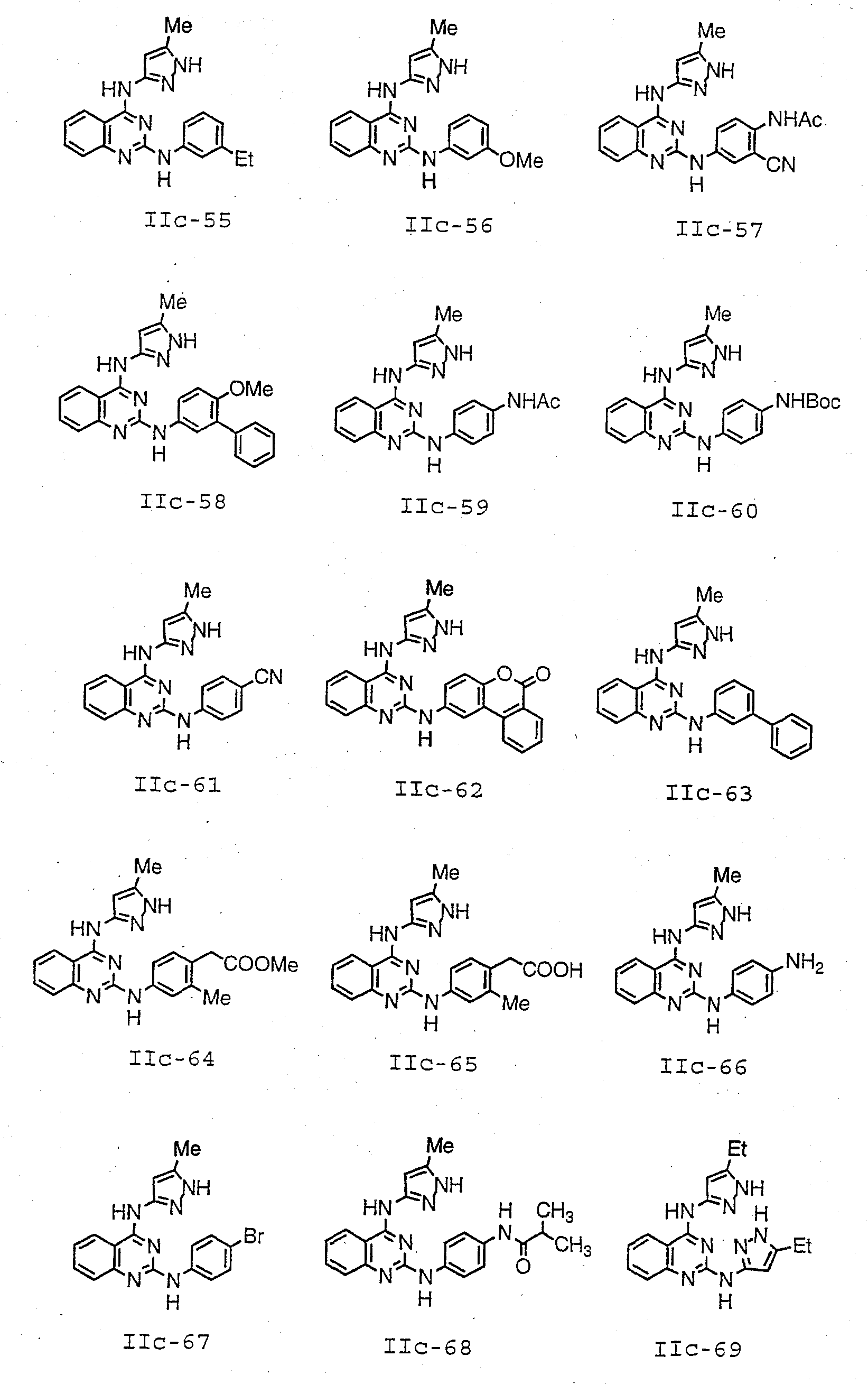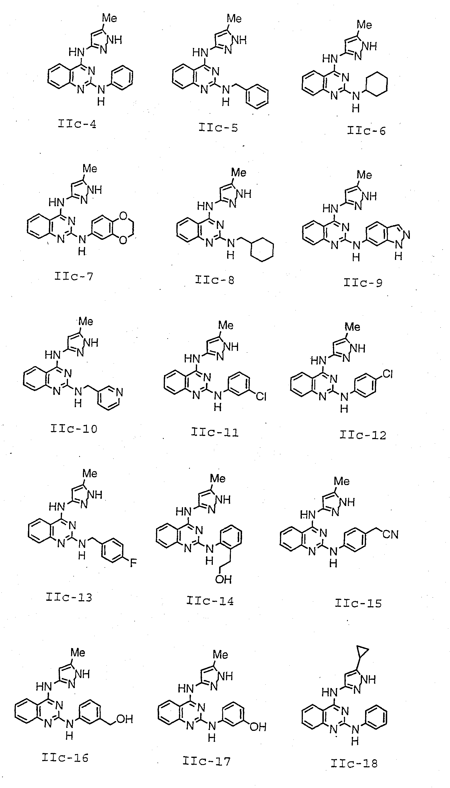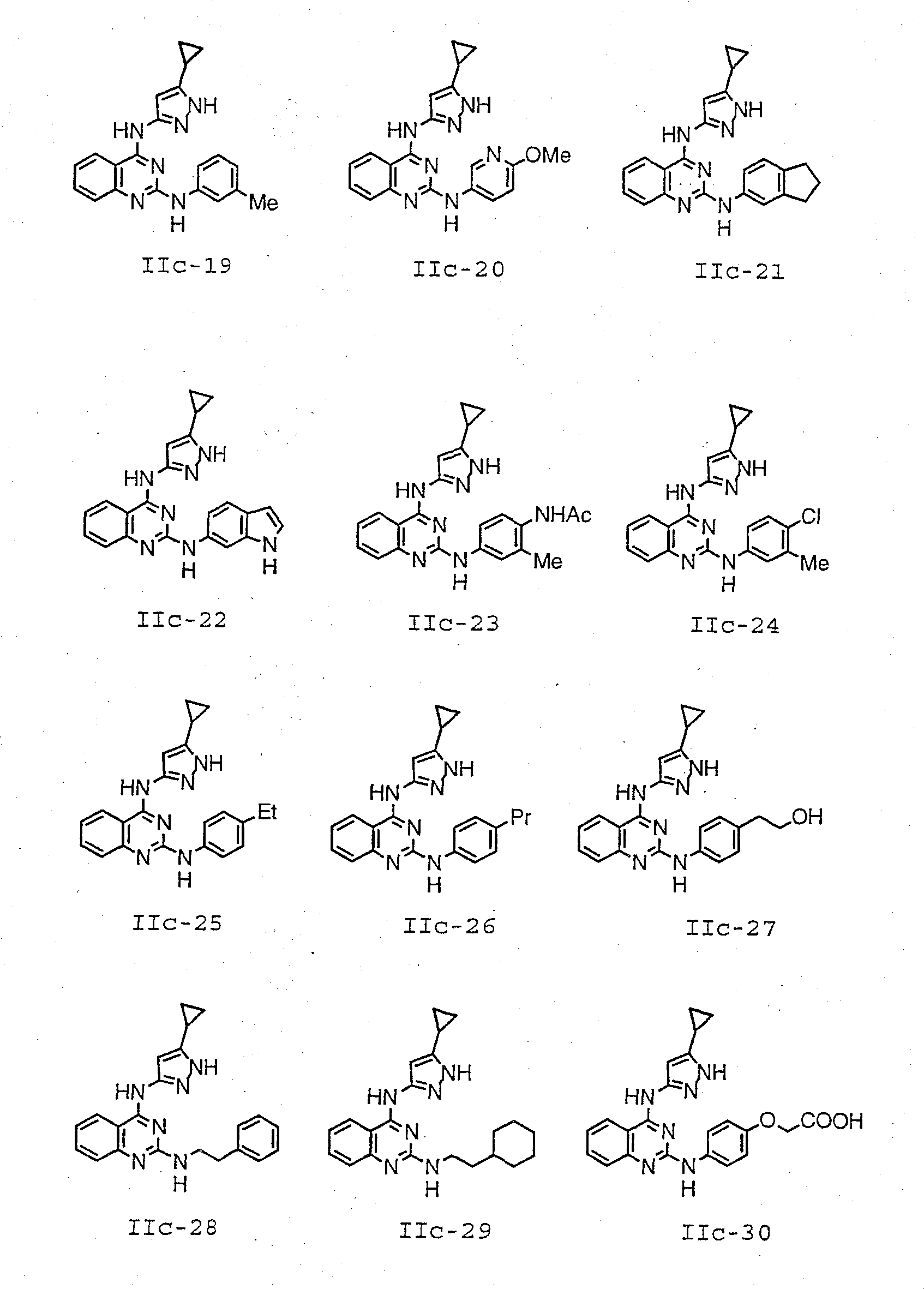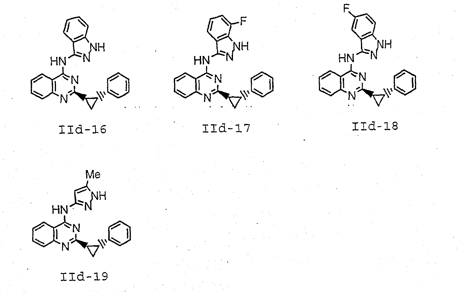 10-5 моль), а затем 1 М бензилмагнийхлорид в ТГФ (2,15 мл, 2,15 ммоль). Раствор нагревают при 50°С в течение 20 часов и затем реакционную смесь гасят водным NH4Cl и продукт экстрагируют этилацетатом. Выпаривают растворитель и остаток очищают флэш-хроматографией с получением требуемого (2-бензилхиназолин-4-ил)-(5-циклопропил-2Н-пиразол-3-ил)амина.