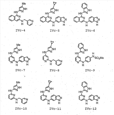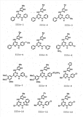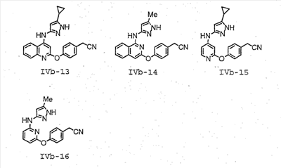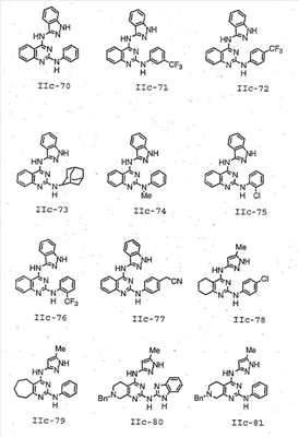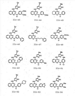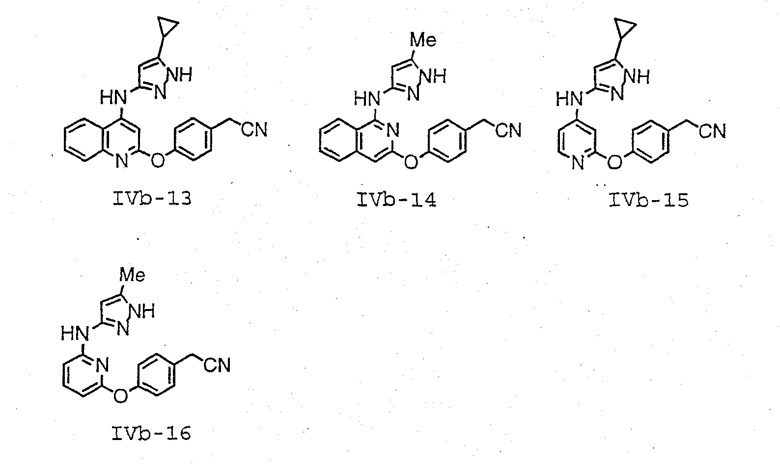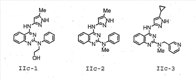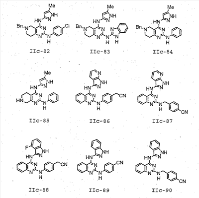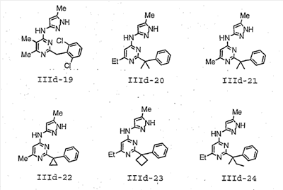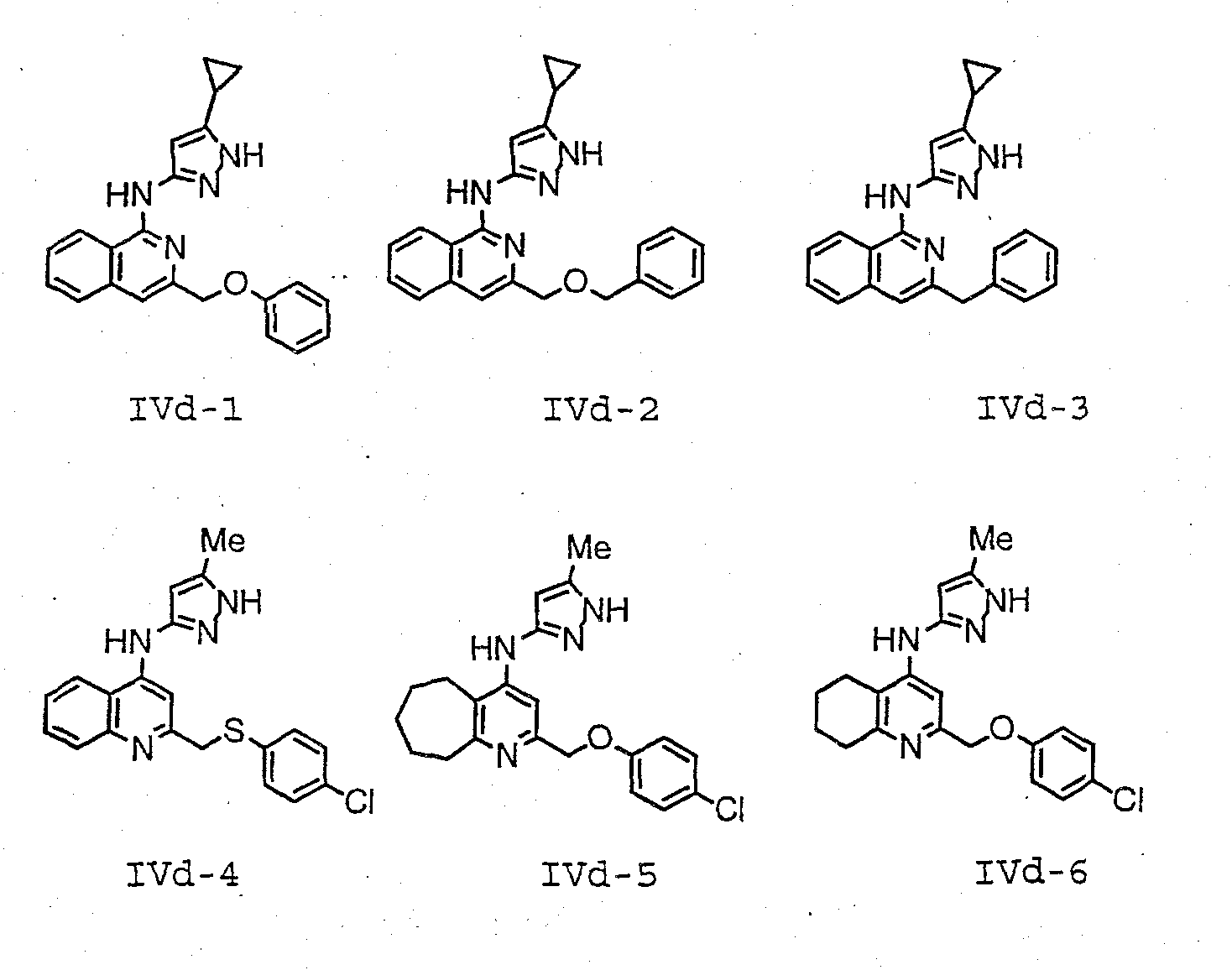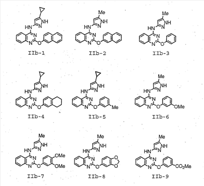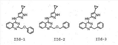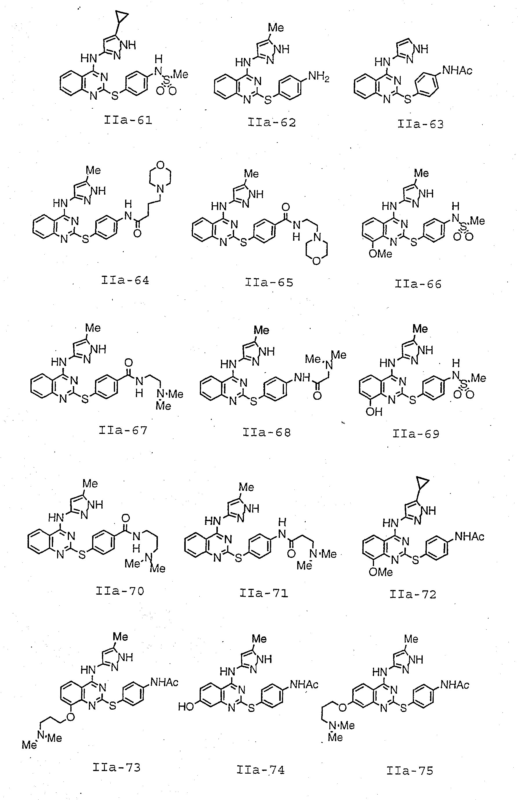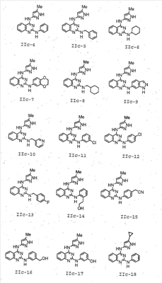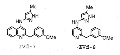 10-5 моль), а затем 1 М бензилмагнийхлорид в ТГФ (2,15 мл, 2,15 ммоль). Раствор нагревают при 50°С в течение 20 часов и затем реакционную смесь гасят водным NH4Cl и продукт экстрагируют этилацетатом. Выпаривают растворитель и остаток очищают флэш-хроматографией с получением требуемого (2-бензилхиназолин-4-ил)-(5-циклопропил-2Н-пиразол-3-ил)амина.