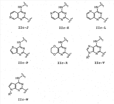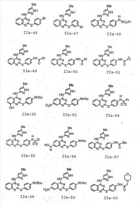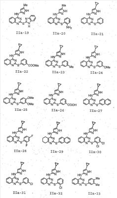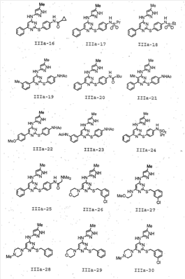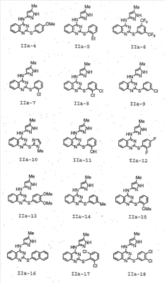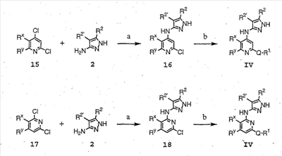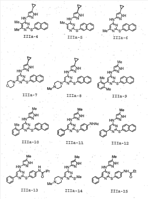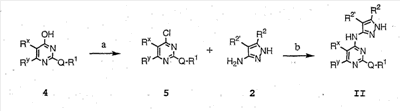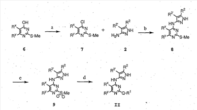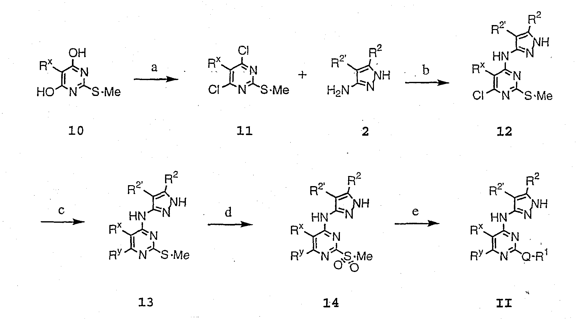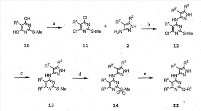 2585906 (ICI, 1949). Метилсульфанильная группа соединения 13 может быть затем окислена с получением метилсульфона 14. Замещение метилсульфонильной группы соединения 14 дает требуемый продукт II.