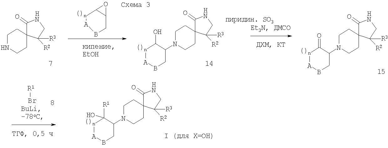 -аминоспирт формулы 14 затем может быть окислен в кетон, предпочтительно с комплексом пиридин-SO3 в присутствии триэтиламина в ДМСО, давая соединения формулы 15, которые затем обрабатывают ариллитиевыми реагентами (образованные обменом галоида на металл), чтобы обеспечить подход к требуемым продуктам формулы I (схема 3).