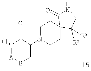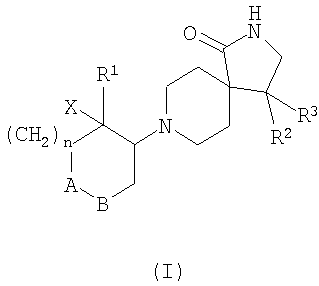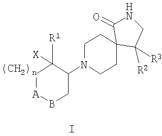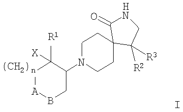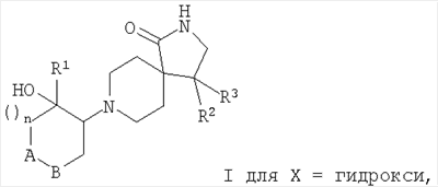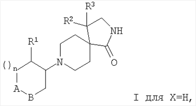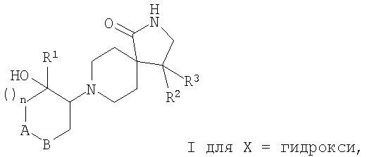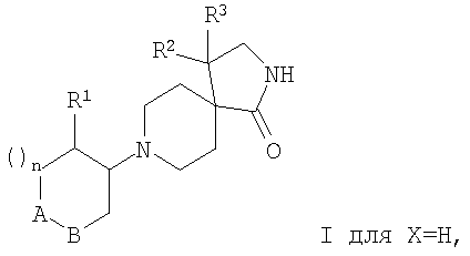где А-В означает -СН2-СН2– или -СН2-О-; Х означает водород или гидрокси; R1 означает фенил, необязательно замещенный одним или двумя заместителями, выбранными из группы, состоящей из галоида (низш.)алкила, циано, CF3, -OCF3, (низш.)алкокси, -SO2-(низш.)алкила, или гетероарилом; R2 означает фенил, необязательно замещенный одним или двумя заместителями, выбранными из группы, состоящей из галоида или (низш.)алкокси; R3 означает водород; n означает 1, и их фармацевтически активные соли. Наиболее предпочтительными являются соединения, где n означает 1, а А-В означает -СН2-СН2-. Особенно предпочтительными соединениями из этой группы являются те, в которых R1 и R2 означают оба фенил, необязательно замещенный (низш.)алкилом, галоидом или CF3, например, следующие соединения: цис-рац-4-фенил-8-(2-фенилциклогексил)-2,8-диазаспиро[4.5]декан-1-он, цис-рац-4-фенил-8-(2-n-толилцикогексил)-2,8-диазаспиро[4.5]декан-1-он, цис-рац-8-[2-(4-фторфенил)циклогексил]-4-фенил-2,8-диазаспиро[4.5]декан-1-он, цис-рац-4-(4-фторфенил)-8-[2-(4-фторфенил)циклогексил]-2,8-диазаспиро[4.5]декан-1-он, цис-рац-4-(4-фторфенил)-8-[2-(4-трифторметилфенил)циклогексил]-2,8-диазаспиро[4.5]декан-1-он, 8-[2-(4-фторфенил)-2-гидроксициклогексил]-4-фенил-2,8-диазаспиро[4.5]декан-1-он, 4-(4-фторфенил)-8-[2-(3-фторфенил)-2-гидроксициклогексил]-2,8-диазаспиро[4.5]декан-1-он, 4-(4-фторфенил)-8-[2-(2-фторфенил)-2-гидроксициклогексил]-2,8-диазаспиро[4.5]декан-1-он, 8-[2-(3-хлорфенил)-2-гидроксициклогексил]-4-(4-фторфенил)-2,8-диазаспиро[4.5]декан-1-он или 4-(4-фторфенил)-8-транс-(4-гидрокси-4-фенилтетрагидропиран-3-ил)-2,8-диазаспиро[4.5]декан-1-он. Кроме того, предпочтительными являются соединения, в которых Х означает водород. Изобретение относится также к соединениям, в которых Х означает гидрокси. Объектами по настоящему изобретению являются, кроме того, соединения, в которых n означает 1, а А-В означает -СН2-О-. Данные соединения формулы I и их фармацевтически приемлемые соли могут быть получены способами, известными в данной области, например способами, описанными ниже, которые включают а) взаимодействие соединения формулы
