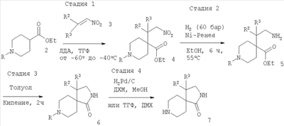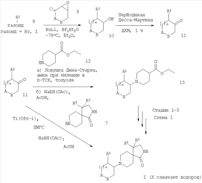 с образованием соединения формулы где заместители имеют значения, определенные выше, или в) при необходимости разделение рацемических форм на соответствующие энантиомеры и при необходимости превращение полученных соединений в фармацевтически приемлемые кислотно-аддитивные соли. Соединения формулы I могут быть получены в соответствии с вариантами способа а), б) или в) и со следующими схемами 1, 2 и 3. Использованы следующие аббревиатуры: ЛДА – диизопропиламид лития ТФК – трифторуксусная кислота ДХМ – дихлорметан ТГФ – тетрагидрофуран ПМГС – полиметилгидросилоксан ДМСО – диметилсульфоксид Исходя из соответствующим образом 1-замещенного пиперидин-4-алкилкарбоксилата 2, обработка с походящим основанием, обычно ЛДА, затем обработка с соответствующим образом замещенным нитроалкеном 3 приводит к нитроалкану 4. Восстановление аминогруппы, облегченное применением Ni-Ренея и водорода, обычно при давлении 60 бар и 55°С в этаноле в качестве растворителя, приводит к образованию соединения 5. Последующая циклизация путем нагревания в толуоле при кипении дает амид 6. Удаление защитной группы при стандартных условиях (обработка с ТФК в ДХМ для защитной группы R = трет-бутилоксикарбонил (Boc) или гидрогенолиз с Pd/C в ДХМ и метаноле для защитной группы R = бензил (Bn)) дает диазаспиропиперидины 7 (схема 1). Схема 1 Дальнейшее взаимодействие соединений формулы 7 с соответствующими соединениями формулы 11 (которые могут быть получены реакцией арилгалоидов формулы 8 с бутиллитием и последующей реакцией с эпоксидом формулы 9 для получения спиртов формулы 10, которые окисляют в соответствующие кетоны формулы 11 с перйодинаном Десса-Мартина) в присутствии тетраизопропоксититана и триацетоксиборогидрида натрия дает соединения формулы I (схема 2). Альтернативно реакция соединений формул 7 и 11 в присутствии тетраизопропоксититана и триацетоксиборогидрида натрия (в присутствии или без ПМГС) также дает продукты формулы I. Альтернативная стратегия, при которой полное восстановительное аминирование кетонов формулы 11 с соединениями формулы 12 в приборе с ловушкой Дина-Старка дает промежуточный енамин, который может быть восстановлен in situ в соединение формулы 13. Следующие стадии 1-3, которые описаны на схеме 1, дают соединение формулы I. Схема 2 Соединения формулы I при Х=ОН получают взаимодействием соединений формулы 7 с оксидами формулы 9 в кипящем этаноле. Образующийся Все соединения формул 1, 4, 5, 6, 7, 11, 10, 13, 14, 15 обычно образуются в ходе последовательных реакций в равной смеси (R,R,S)-, (S,S,R)-, (R,R,R)- и (S,S,S)-энантиомеров (рацемических форм) согласно методикам, описанным ниже. Они могут разделяться на хиральные нерацемические энантиомеры препаративной ВЭЖХ с использованием колонки Chiralpak OD или AD (5×50 см) при комнатной температуре с применением мобильной фазы этанол-гептан и с УФ-детектированием при 220 нм. Кислотно-аддитивные соли основных соединений формулы I могут быть превращены в соответствующие свободные основания путем обработки по меньшей мере стехиометрическим эквивалентом подходящего основания, такого, как гидроксид натрия или калия, карбонат калия, бикарбонат натрия, аммиак и тому подобное. Соединения формулы I и их фармацевтически применимые кислотно-аддитивные соли обладают ценными фармакологическими свойствами. Конкретно было найдено, что соединения по 