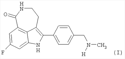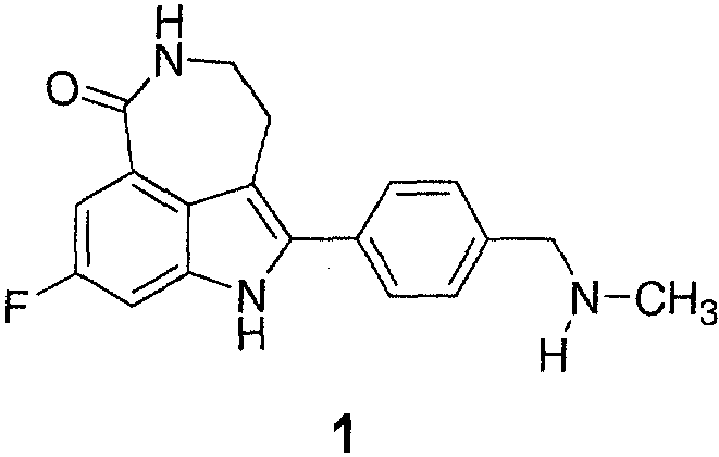 Из-за этой двойственной роли PARP-1 ингибиторы этого фермента, такие как 8-фтор-2-{4-[(метиламино)метил]фенил}-1,3,4,5-тетрагидро-6Н-азепино[5,4,3-cd]индол-6-он, представленный формулой 1, могут играть роль хемосенситизирующих агентов (предупреждая репарацию ДНК, например, после противораковой терапии) или средств для лечения различных болезненных и токсических состояний, в которые вовлечены оксидативный или индуцированный оксидом азота стресс и последующая гиперактивация PARP. Такие состояния включают неврологические и нейродегенеративные расстройства (например болезнь Паркинсона, болезнь Альцгеймера) (Love S, Barber R, Wilcock GK. Increased poly(ADP-ribosyl)ation of nuclear proteins in Alzheimer’s disease. Brain 1999; 122:247-53; Mandir AS, Przedborski S, Jackson-Lewis V, et al. Poly(ADP-robose) polymerase activation mediates l-methyl-4-phenyl-1,2,3,6-tetrahydropyridine (MPTP)-induced parkinsonism. Proc. Natl. Acad. Sci. USA 1999; 96: 5774-9);