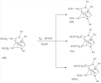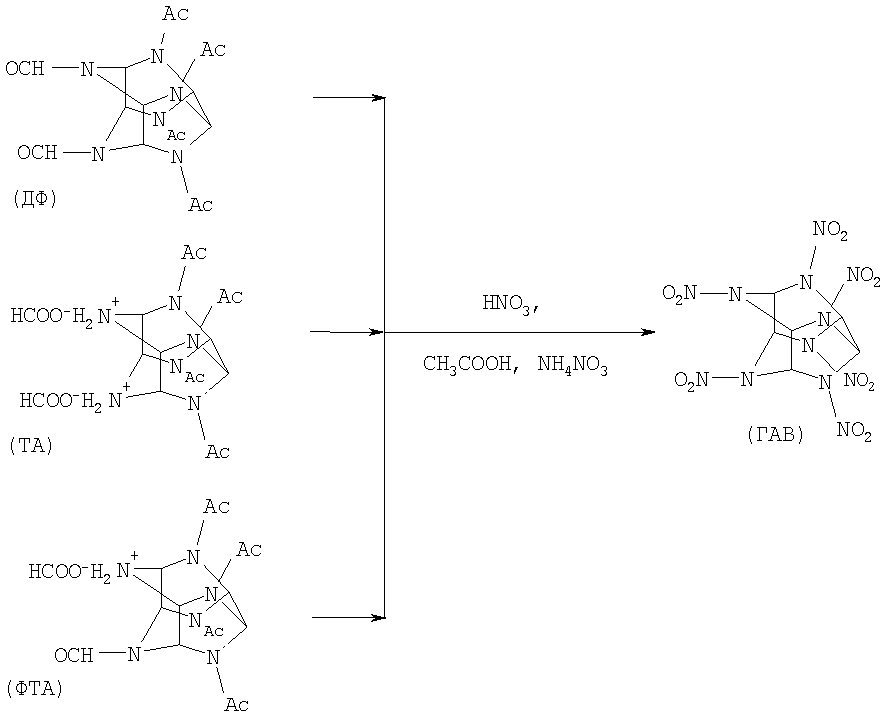 Изобретение относится к органической химии, а именно к способам получения высокоэффективного, мощного взрывчатого вещества 2,4,6,8,10,12-гексанитро-2,4,6,8,10,12-гексаазатетрацикло[5,5,0,03,11,05,9]додекана (ГАВ). Существует ряд способов получения 2,4,6,8,10,12-гексанитро-2,4,6,8,10,12-гексаазатетрацикло[5,5,0,03,11,05,9]додекана (ГАВ) из 4,10-диформил-2,6,8,12-тетраацетил-2,4,6,8,10,12-гексаазатетрацикло[5,5,0,03,11,05,9]додекана (ДФ). Известен способ (Wardle и др. US Pat 6.147.209. 14.11.2000), в котором осуществляют гидрогенолиз 4,10-дибензил-2,6,8,12-тетраацетил-2,4,6,8,10,12-гексаазатетрацикло[5,5,0,03,11,05,9]додекана (ДБ) в среде муравьиной кислоты и проводят нитрование ДФ. Существенным недостатком данного способа является использование на стадии нитрования кристаллического ДФ, который получают из ДБ упариванием под вакуумом, что требует сложного аппаратурного оформления, увеличенной продолжительности нагрева и доли побочных процессов (в результате гидролиза ДФ образуются растворимые продукты, ведущие к снижению выхода ДФ). Также известен способ по патенту Известно, что гидрирование ДБ сопровождается образованием солей моноформил 2,6,8,12-тетраацетил-2,4,6,8,10,12-гексаазатетрацикло[5,5,0,03,11,05,9]додекана (ФТА) и 2,6,8,12-тетраацетил-2,4,6,8,10,12-гексаазатетрацикло[5,5,0,03,11,05,9]додекана (ТА), которые при нитровании образуют ГАВ (Sanderson A.J., Warner R., Wardle R.B., World Pat. WO 00/52011). Эти же продукты образуются из ДФ при длительной выдержке или сильном нагревании водосодержащих растворов. Побочные продукты еще менее стабильны, чем ДФ, и в условиях выделения подвергаются гидролизу с образованием смеси продуктов, не образующих при нитровании ГАВ. Таким образом, в силу имеющих место потерь ДФ и побочно образующихся солей известный способ предполагает увеличенные расход сырья и количество примесей в конечном продукте ГАВ. Кроме того, способ насыщен технологическими операциями, одна из которых – стадия сушки – является пожароопасной. Задачей настоящего изобретения является создание способа получения ГАВ с высоким выходом целевого продукта (в пересчете на ДБ) при одновременном снижении насыщенности технологическими операциями и повышении безопасности процесса путем предотвращения потерь ДФ и формиатных солей ТА и ФТА на стадиях, предшествующих нитрованию, и их полного использования на стадии нитрования. Поставленная задача решается предложенным способом получения ГАВ, при котором осуществляют гидрирование ДБ и нитрование полученной реакционной смеси раствором нитрата аммония в азотной кислоте. Согласно изобретению реакционную смесь перед нитрованием частично упаривают под вакуумом при температуре 45-50°С или частично упаривают и обрабатывают уксусным ангидридом, или частично упаривают с добавлением уксусной кислоты. Предлагаемый способ отличается от прототипа иным агрегатным состоянием продукта, используемого на стадии нитрования. В прототипе нитрованию подвергают кристаллический ДФ (продукт дебензилирования ДБ), а в предлагаемом способе – раствор, получающийся обработкой реакционной смеси со стадии гидрирования ДБ. Нитрование растворов ДФ (обработанной реакционной смеси) изменяет условия нитрования и позволяет обеспечить достижение заявленного технического результата. Гидрирование ДБ в среде муравьиной кислоты приводит к образованию ДФ, толуола и воды. Прямое нитрование полученной реакционной смеси приводит к получен