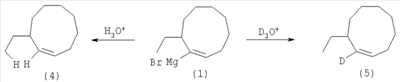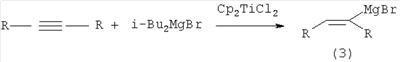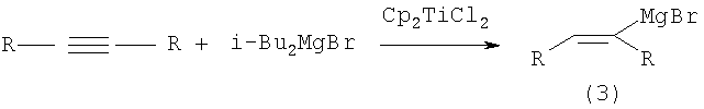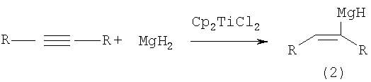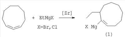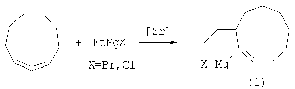 Известным способом не могут быть получены (9-этил-1-циклононенил)магнийгалогениды общей формулы (1). Известен способ [F.Sato, H.Ishikawa, M.Sato. Cp2TiCl22TiCl2 при 20°С в эфире по схеме: Известный способ не позволяет получать (9-этил-1-циклононенил)магнийгалогениды общей формулы (1). Таким образом, в литературе отсутствуют сведения по селективному синтезу (9-этил-1-циклононенил)магнийгалогенидов общей формулы (1). Предлагается новый способ региоселективного синтеза (9-этил-1-циклононенил)магнийгалогенидов общей формулы (1). Сущность способа заключается во взаимодействии 1,2-циклононадиена с этилмагнийгалогенидом EtMgX, где Х=Br, Cl, в присутствии катализатора цирконацендихлорида Cp2ZrCl2, взятых в мольном соотношении 1,2-циклононадиен: EtMgX:Cp2ZrCl2=10:(15-25):(0.4-0.6), предпочтительно 10:20:0.5. Реакцию проводят в атмосфере аргона при комнатной температуре (~20°С) и атмосферном давлении. Время реакции 6-10 ч, выход целевого продукта 50-68%. В качестве растворителя необходимо использовать тетрагидрофуран. Реакция протекает по схеме: Целевой продукт (1) образуется только лишь с участием 1,2-циклононадиена, EtMgX и катализатора Cp2ZrCl2. В присутствии других циклодиенов (например, 1,5-циклооктадиена, 1,3-циклооктадиена), других соединений магния (например, BuMgCl, изо-Bu2Mg, изо-BuMgCl, изо-PrMgBr) или других комплексов переходных металлов (например, Zr(acac)4, Ср2TiCl2, Pd(acac)2, Ni(acac)2, Fe(асас)3) целевой продукт (1) не образуется. Проведение реакции в присутствии катализатора Cp2ZrCl2 больше 0.6 ммоль на 10 ммоль 1,2-циклононадиена не приводит к существенному увеличению выхода целевого продукта (1). Использование в реакции катализатора Cp2ZrCl2 менее 0.4 ммоль на 10 ммоль 1,2-циклононадиена снижает выход циклоалкенильного МОС (1), что связано с уменьшением каталитически активных центров в реакционной массе. Опыты проводили при комнатной температуре ~20°С. При более высокой температуре (например, 50°С) увеличиваются энергозатраты и содержание продуктов уплотнения, при меньшей температуре (например, 0°С) снижается скорость реакции. Изменение соотношения исходных реагентов в сторону увеличения содержания EtMgX по отношению к 1,2-циклононадиену не приводит к значительному повышению выхода целевого продукта (1). Снижение количества EtMgX по отношению к 1,2-циклононадиену уменьшает выход циклоалкенильного МОС (1). Существенные отличия предлагаемого способа. Предлагаемый способ базируется на использовании в качестве исходных реагентов 1,2-циклононадиена и EtMgX, а в качестве катализатора Cp2ZrCl2. В известном способе ациклические непредельные магнийорганические соединений (3) получают из дизамещенных ацетиленов, изо-BuMgBr и катализатора Cp2TiCl2. Предлагаемый способ обладает следующими преимуществами. 1. Способ позволяет получать с высокой региоселективностью индивидуальные (9-этил-1-циклононенил)магнийгалогениды общей формулы (1), синтез которых в литературе не описан. Способ поясняется следующими примерами: ПРИМЕР 1. В стеклянный реактор, установленный на магнитной мешалке, в атмосфере аргона помещают 0.5 ммоль цирконацендихлорида Cp2ZrCl2, 10 ммоль 1,2-циклононадиена и при температуре ~0°С 20 ммоль EtMgBr (1.8M раствор в ТГФ). Перемешивают при комнатной температуре 8 часов. Получают индивидуальный (9-этил-1-циклононенил)магнийбромид общей формулы (1) с выходом 59%. Выход целевого продукта определяли по продукту гидролиза (4). При дейтеролизе МОС (1) образуется 1-дейтеро-9-этил-1-