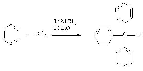 В смесь 100 г бензола и 20 г тетрахлорметана при комнатной температуре порциями по 5 г в течение часа добавляют 20 г безводного хлористого алюминия, нагревают до кипения и выдерживают еще 6 ч, после чего добавляют 100 мл 10% соляной кислоты и перемешивают при кипении 1 ч. Органический слой отделяют и отгоняют из него не вошедшие в реакцию бензол и тетрахлорметан, остаток перекристаллизовывают из гексана.