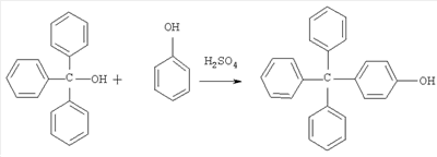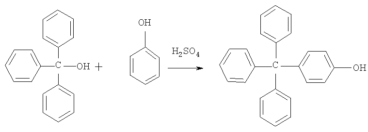 Смесь 16 г трифенилметанола и 7 г фенола растворяют в 30 мл уксусной кислоты, добавляют 3 мл концентрированной серной кислоты, нагревают и выдерживают при температуре кипения 10 ч. Реакционную массу охлаждают, разбавляют 100 мл воды, выпавший осадок отфильтровывают и промывают последовательно 100 мл 10%-ного раствора едкого натра, 200 мл воды, 10 мл ацетона и высушивают.