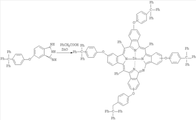 Смесь 2.0 г 4-(п-трифенилметилфенокси)-1,3-дииминоизоиндолина, 6.0 г фенилуксусной кислоты и 1.0 г оксида цинка нагревают 40 мин при 290°С. Расплав охлаждают, измельчают, кипятят 5 мин в 100 мл 10%-ного раствора КОН, отфильтровывают, промывают 100 мл воды и высушивают. Остаток растворяют в толуоле и хроматографируют на колонке, заполненной оксидом алюминия II степени активности (элюент – смесь толуол-ацетон, 50:1 по объему), собирая первую зеленую зону.
