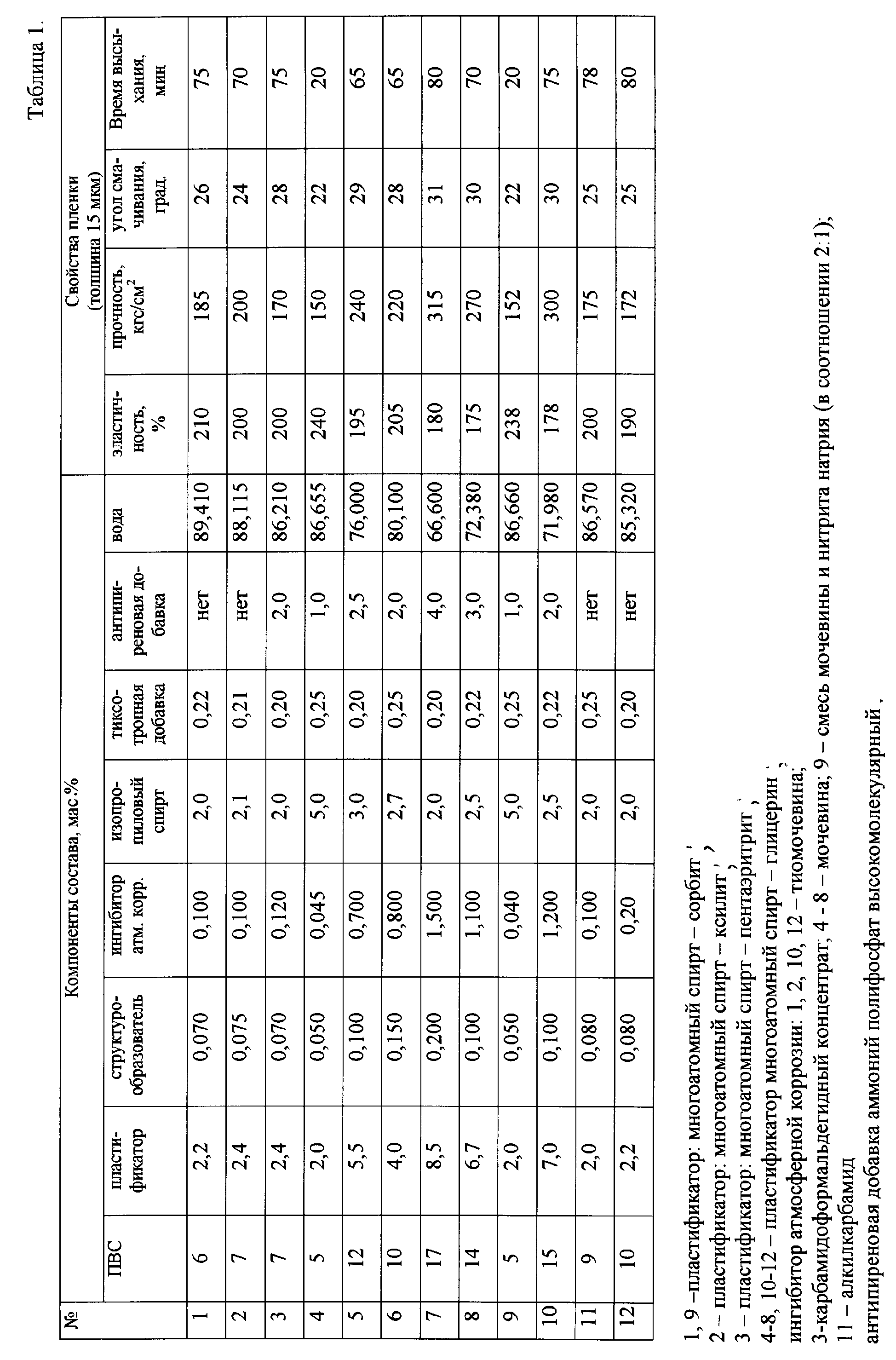 1. Состав для нанесения пленочных покрытий, содержащий в качестве основного компонента поливиниловый спирт, воду, а также функциональные компоненты – многоатомный спирт в качестве пластификатора, ингибитор атмосферной коррозии на основе мочевины и тиксотропный компонент, отличающийся тем, что состав содержит структурообразователь на основе оксиэтилированного спирта и изопропиловый спирт, при этом компоненты находятся в соотношении, мас.%: