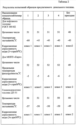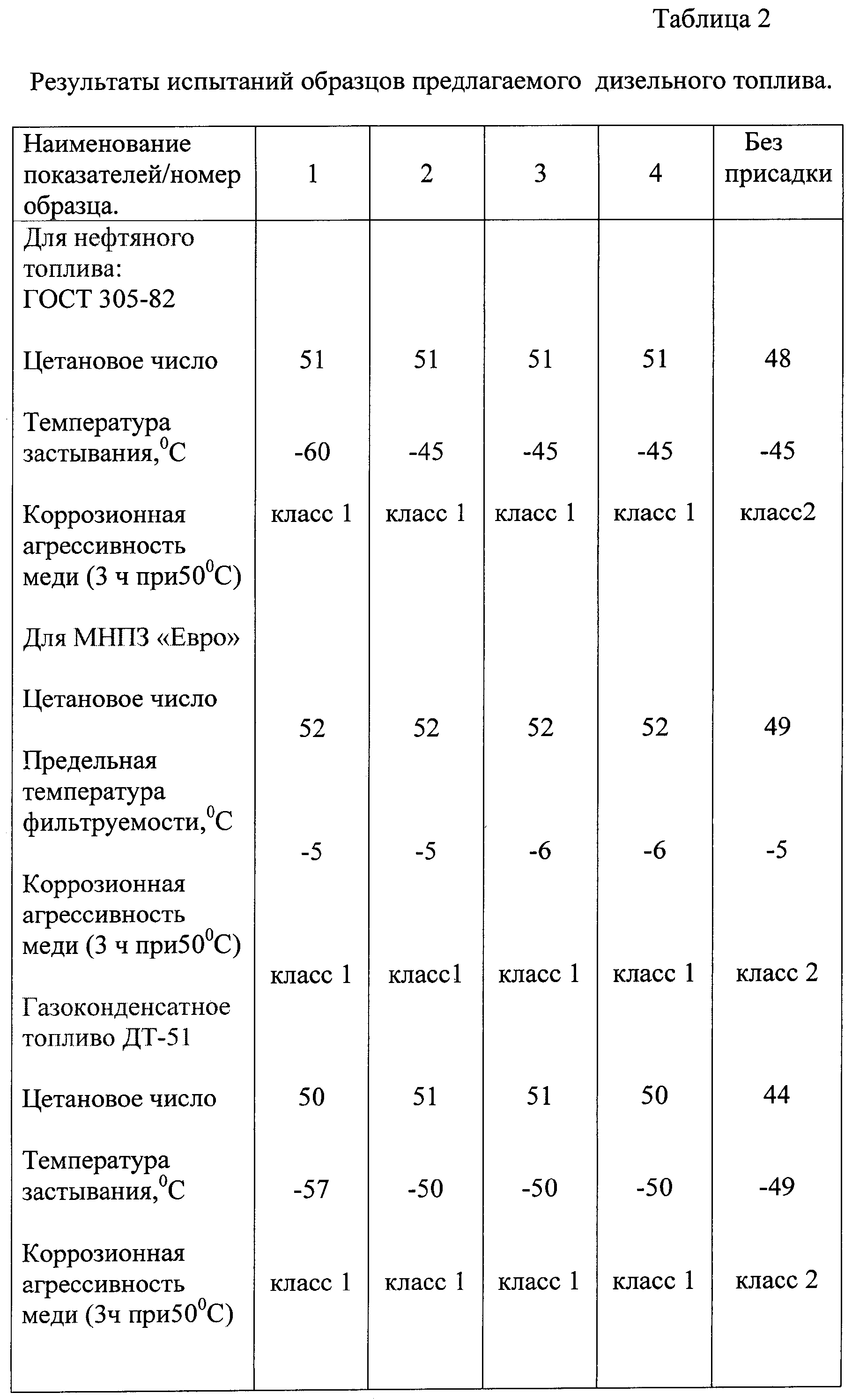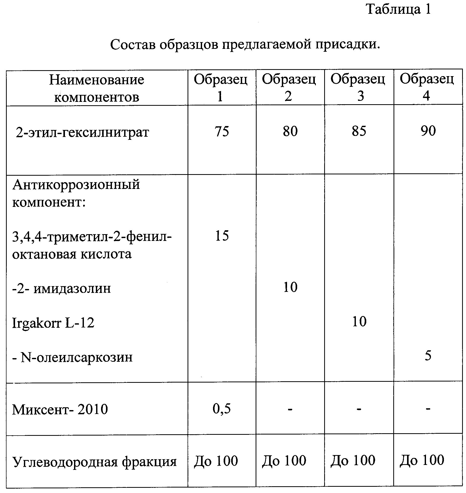 Там же описан состав дизельного топлива на основе летнего или зимнего дизельного топлива, содержащий вышеуказанную присадку в количестве 0,01-0,5 мас.%. Известная присадка обеспечивает улучшение низкотемпературных свойств дизельного топлива и повышает его самовоспламеняемость (т.е. улучшает пусковые свойства), однако при длительном хранении топлив, особенно в условиях холодного климата, происходит конденсация, и капельки влаги способствуют протеканию процессов гидролиза и окисления топлив, вследствие этого дизельные топлива, содержащие известную присадку, склонны к протеканию коррозии. Задачей изобретения является разработка присадки к дизельному топливу, которая наряду с улучшением низкотемпературных и пусковых свойств дизельного топлива препятствует протеканию коррозии, а также разработка дизельного топлива, содержащего эту присадку. Для решения поставленной задачи предлагается присадка к дизельному топливу, содержащая алкил(С3-С18)нитрат – 75-90 мас.%, антикоррозионный компонент в количестве 5,0-15,0 мас.%, выбранный из группы: 3,4,4-триметил-2-фенилоктановая кислота; 2-имидазолин; алкил(С4-С9)тиазолидин; N-олеилсаркозин; и углеводородную фракцию, выкипающую в интервале 120-270°С, до 100. Причем присадка дополнительно содержит в своем составе сополимер на основе этиленненасыщенных мономеров в количестве 0,5-1,5 мас.%. Предлагается также дизельное топливо на основе базового топлива, содержащее предлагаемую присадку в количестве 0,01-0,8 мас.%. Причем в качестве базового топлива оно содержит нефтяное дизельное топливо или газоконденсатное топливо. Отличия заявляемого технического решения состоят в использовании в составе присадки антикоррозионного компонента, представляющего собой указанные выше соединения, облегченной углеводородной фракции, а также в подобранном соотношении компонентов. Предлагаемая присадка обеспечивает дизельному топливу, ее содержащему, комплекс требуемых свойств. Присадка, предназначенная для использования в дизельных топливах, используемых в сложных климатических условиях, в том числе в районах Крайнего Севера, дополнительно содержит в своем составе сополимер на основе этиленненасыщенных мономеров. Предлагаемую присадку готовят путем смешения компонентов при повышенной температуре и постоянном перемешивании в течение 3-х часов. Указанным способом было приготовлено 4 образца предлагаемой присадки, состав которых приведен в таблице 1. В качестве алкилнитрата был использован: 2-этил-гексилнитрат, так как он является наиболее доступным, но могут быть использованы и другие алкилнитраты, например циклогексилнитрат. В качестве алкил(С4-С9)тиазолидина в составе приготовленных образцов была использована присадка Irgakorr L-12, представляющая собой 2-алкил(С4-С9)-1,3-тиазолидин, полученный с использованием фракции карбоновых кислот, однако аналогичный результат может быть достигнут при использовании алкилтиазолидинов, полученных на индивидуальных кислотах С4-С9. В качестве сополимера на основе этиленненасыщенных мономеров в составе приготовленных образцов присадки использовали депрессорно-диспергирующую присадку Миксент-2010 на основе сополимера этилена с винилацетатом в углеводородном растворителе мол. мас. около 10.000. В качестве углеводородной фракции использовали прямогонную дизельную фракцию, выкипа