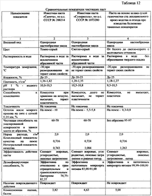 Приведенные данные в таблице 12 показывают, что разработанная паста имеет преимущества перед известными, поскольку очищает поверхность от ржавчины. Кроме того, паста имеет ряд других свойств, в частности дезинфицирующие, и предохраняет поверхность от коррозии.