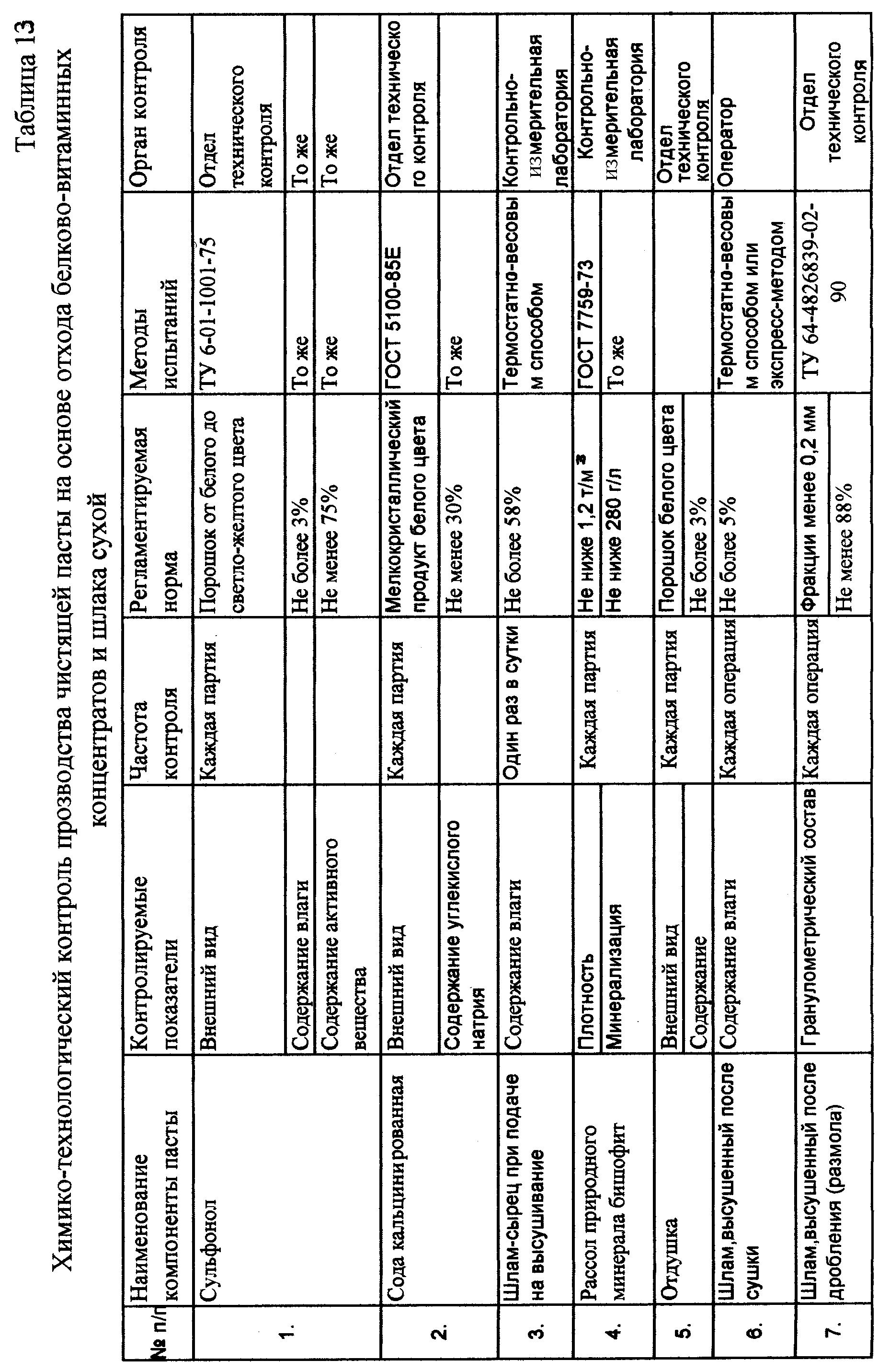 Отходы производства белково-витаминного концентрата, неиспользовавшиеся и шедшие в отвал, в данном составе чистящей пасты используются в натуральном виде и не требуют дополнительной переработки. Введение в состав чистящей пасты других абразивов не требуется. В указанных отходах содержится тонкодисперсная окись кальция (до 15%), железа (до 4,4%), фосфора (до 13%), калия (до 4,5%) и азота (до 13,5%) (см. таблицу 7) с размерами частиц 20-30 мкм, которые являются хорошим абразивом. Они эластичны и способствуют механической очистке загрязненной поверхности. Кроме того, фосфаты сами являются хорошим моющим компонентом. Содержание других солей в отходах незначительно, а поэтому совершенно безвредно для человека.