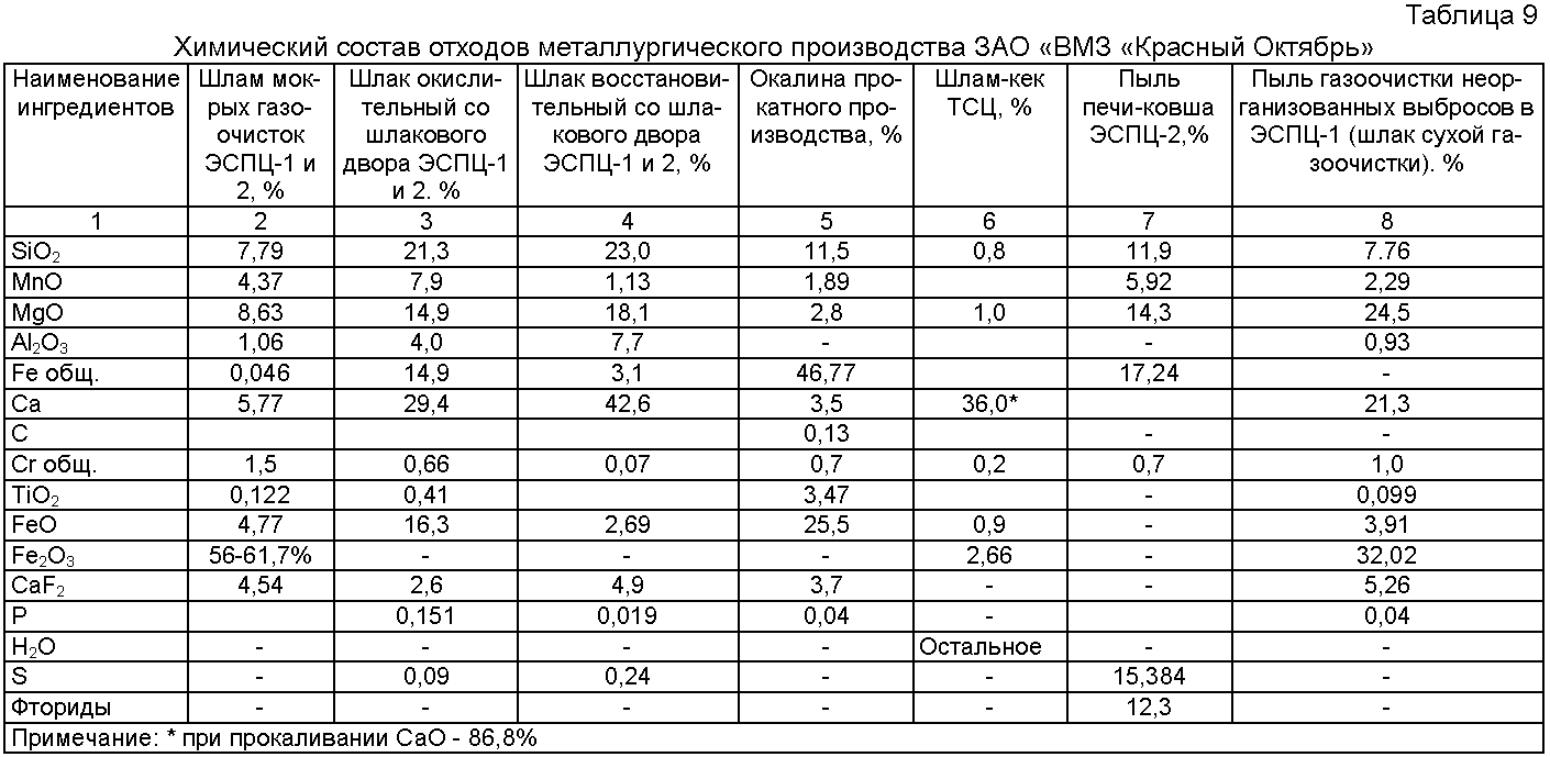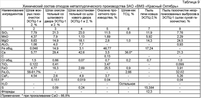 С шлаковен ЗАО «Волгоградский металлургический завод «Красный Октябрь» поставляется шлак сухой газоочистки без металлических примесей фракции 5-100 мкм с высокой степенью сыпучести и влажностью не более 5%. Химический состав отходов мталлургического производства ЗАО «ВМЗ «Красный Октябрь» представлен в таблице 9, а состав твердого шлака из пыли сухой газоочистки электросталеплавильного цеха ЭСЦП-1 – в таблице 10.