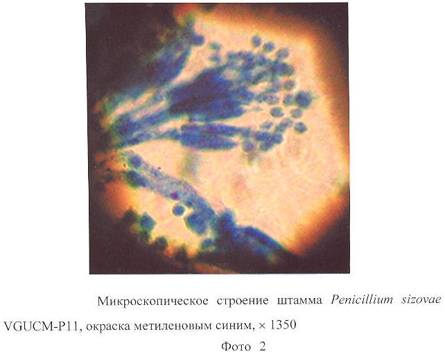 Культуры штамма Penicillium sizovae VGUCM-P11 получают путем выращивания на скошенной в пробирках плотной питательной среде Чапека в течение трех суток при температуре 30°С, хранят при температуре 4-6°С в течение двух месяцев, затем пересевают на новую питательную среду. Лиофильно высушенные культуры получают путем высушивания в вакууме в течение 6 ч, хранят при температуре минус 20°С в течение трех лет.