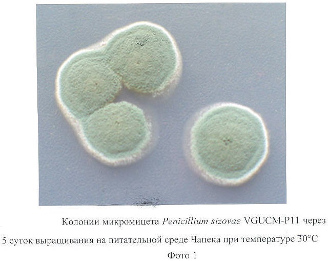 Штамм Penicillium sizovae выращивают в жидкой среде Чапека-Докса (рН 7,2±0,2) в колбах объемом 250 мл в шейкере-инкубаторе при температуре 30°С и скорости перемешивания 200 об/мин в течение двух суток. В качестве инокулята используют культуру, хранящуюся на скошенном в пробирке агаре, внося в жидкую среду 2-3 петли. Выход биомассы составляет 11,2 г/л.