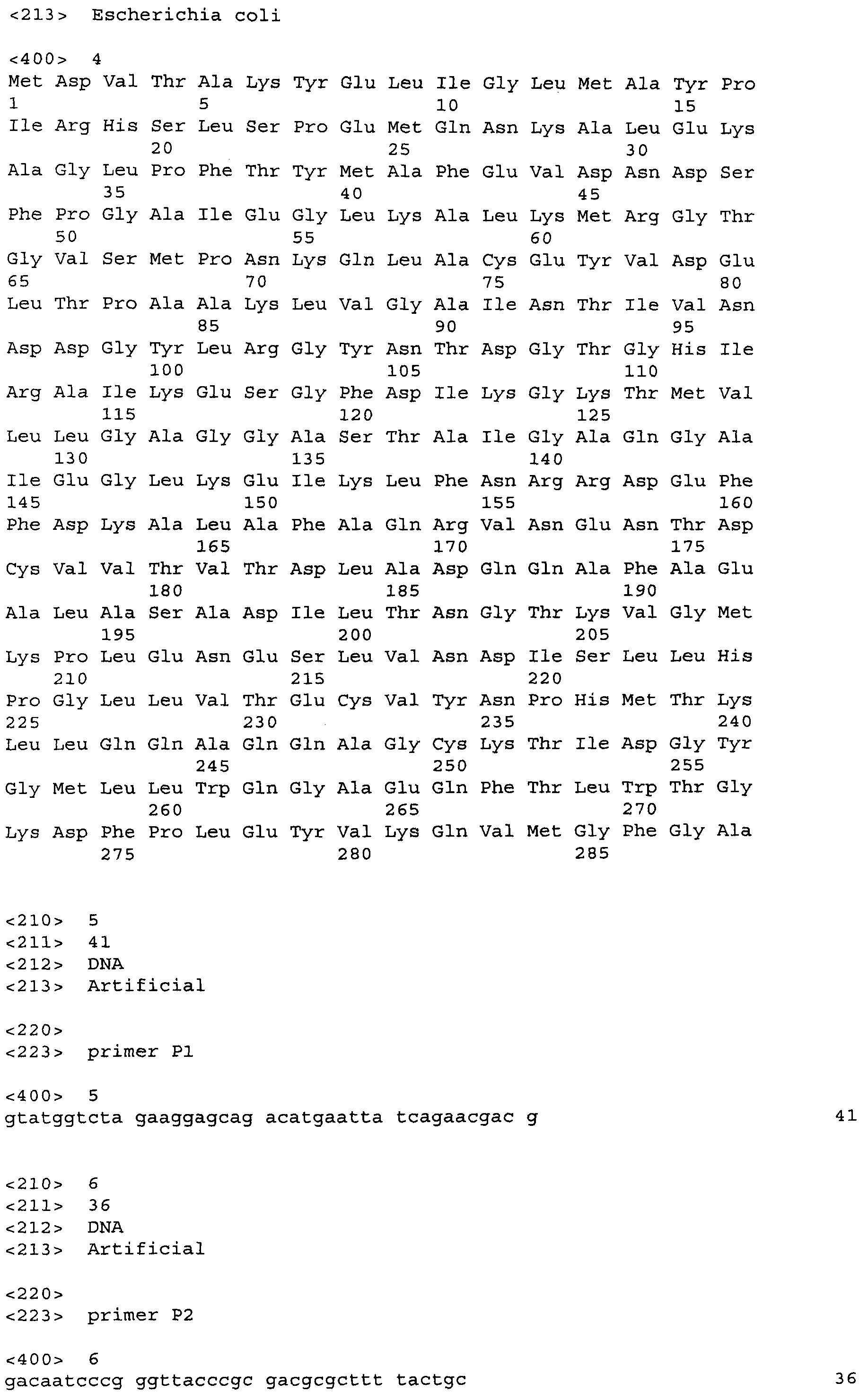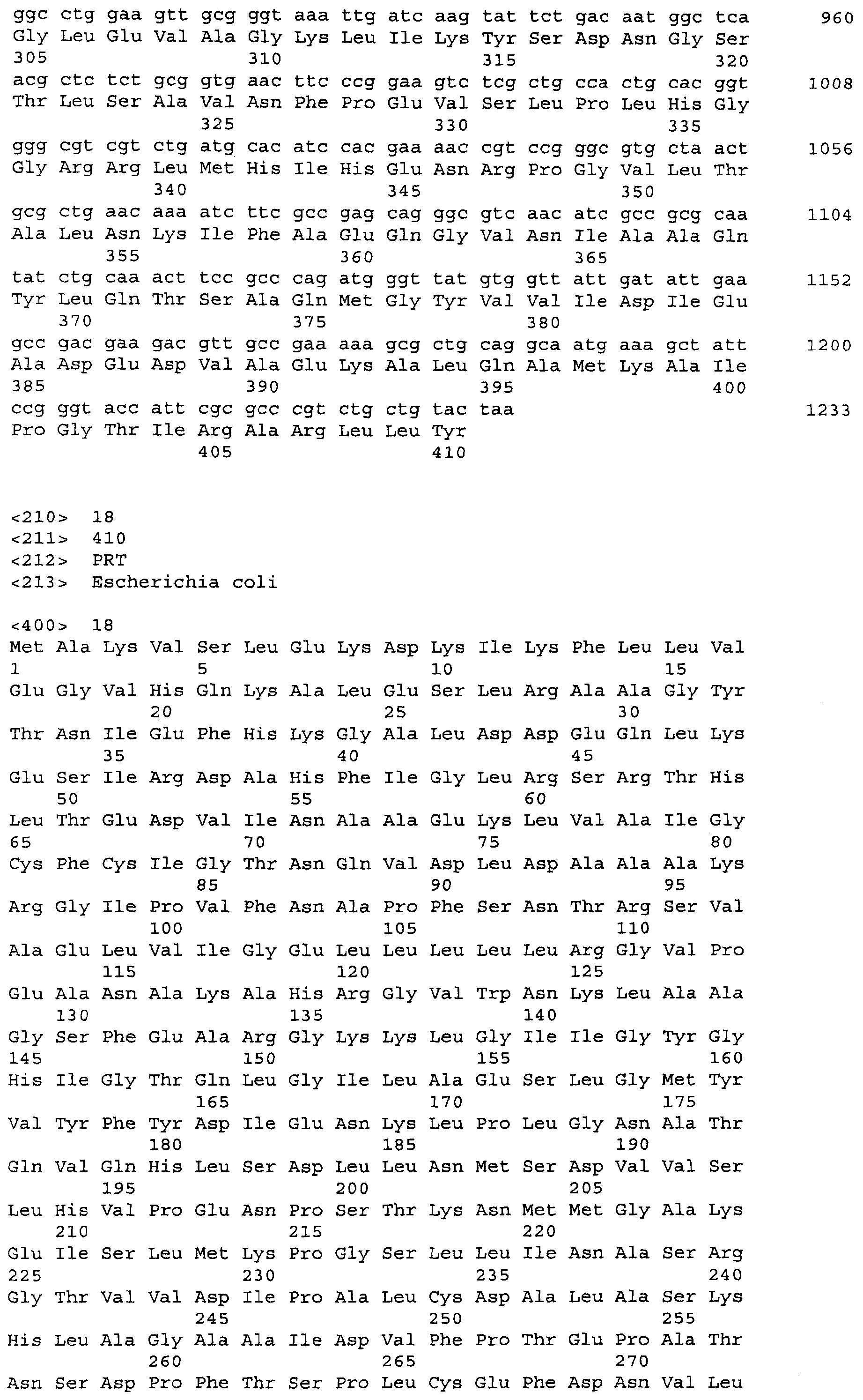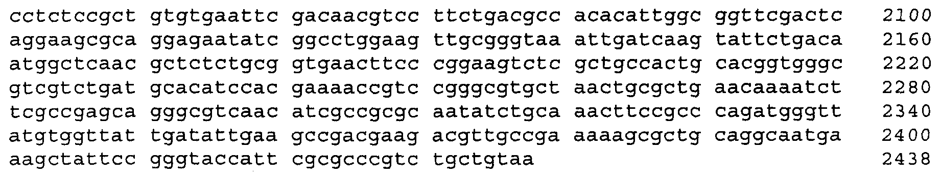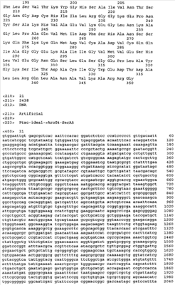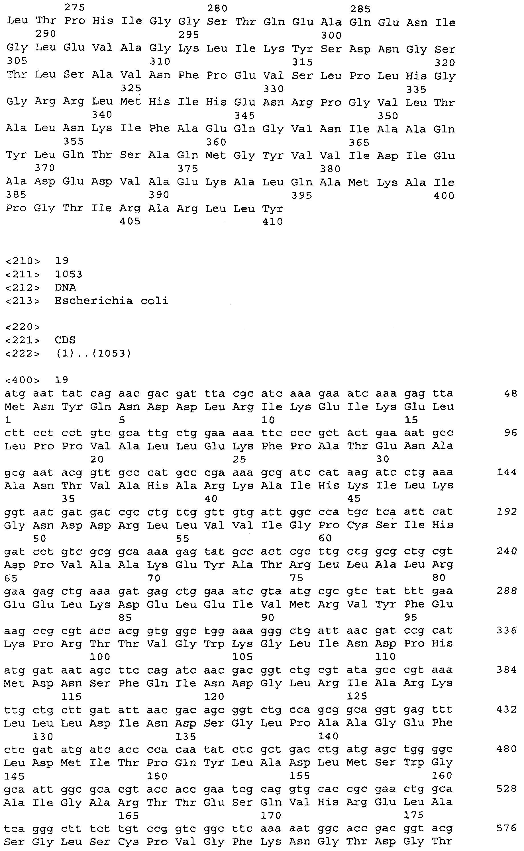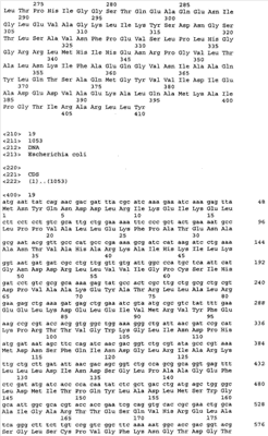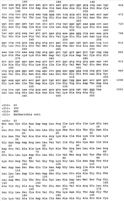 Для увеличения продукции ароматических аминокислот в бактерии может быть ослаблен биосинтез других аминокислот, иных чем целевая ароматическая аминокислота. Например, когда целевая аминокислота- L-триптофан может быть ослаблен биосинтез L-фенилаланина и/или L-тирозина (US 4,371,614). Кроме того, 3-дезокси-D-арабиногептулозонат-7-фосфатсинтетаза (DS), кодируемая генами aroF или aroG, подвержена ингибированию по типу обратной связи ароматическими аминокислотами. Следовательно, бактерия может быть модифицирована таким образом, чтобы содержать мутантную DS, не подверженную ингибированию по типу обратной связи. Такая мутантная DS может быть получена, например, заменой в aroF L-аспарагановой кислоты в положении 147 или L-серина в положении 181 на другую аминокислоту. В случае aroG мутантная DS может быть получена, например, заменой L-аспарагиновой кислоты в положении 146, L-метионина в положении 147, L-пролина в положении 150 или L-аланина в положении 202 на другую аминокислоту или заменой L-метионина в положении 157 и L-аланина в положении 219 на другую аминокислоту. Бактерия – продуцент ароматической L-аминокислоты может быть получена введением в бактерию мутантного гена, кодирующего такую матантную DS (EP 0488424). В особенности предпочтителен мутантный ген aroG (aroG4), в котором L-пролин в положении 150 заменен на L-лейцин. Нуклеотидные последовательности гена aroG дикого типа и аминокислотная последовательность DS, кодируемой геном aroG, приведены в Перечне последовательностей (SEQ ID NO: 19 и SEQ ID NO: 20 соответственно).