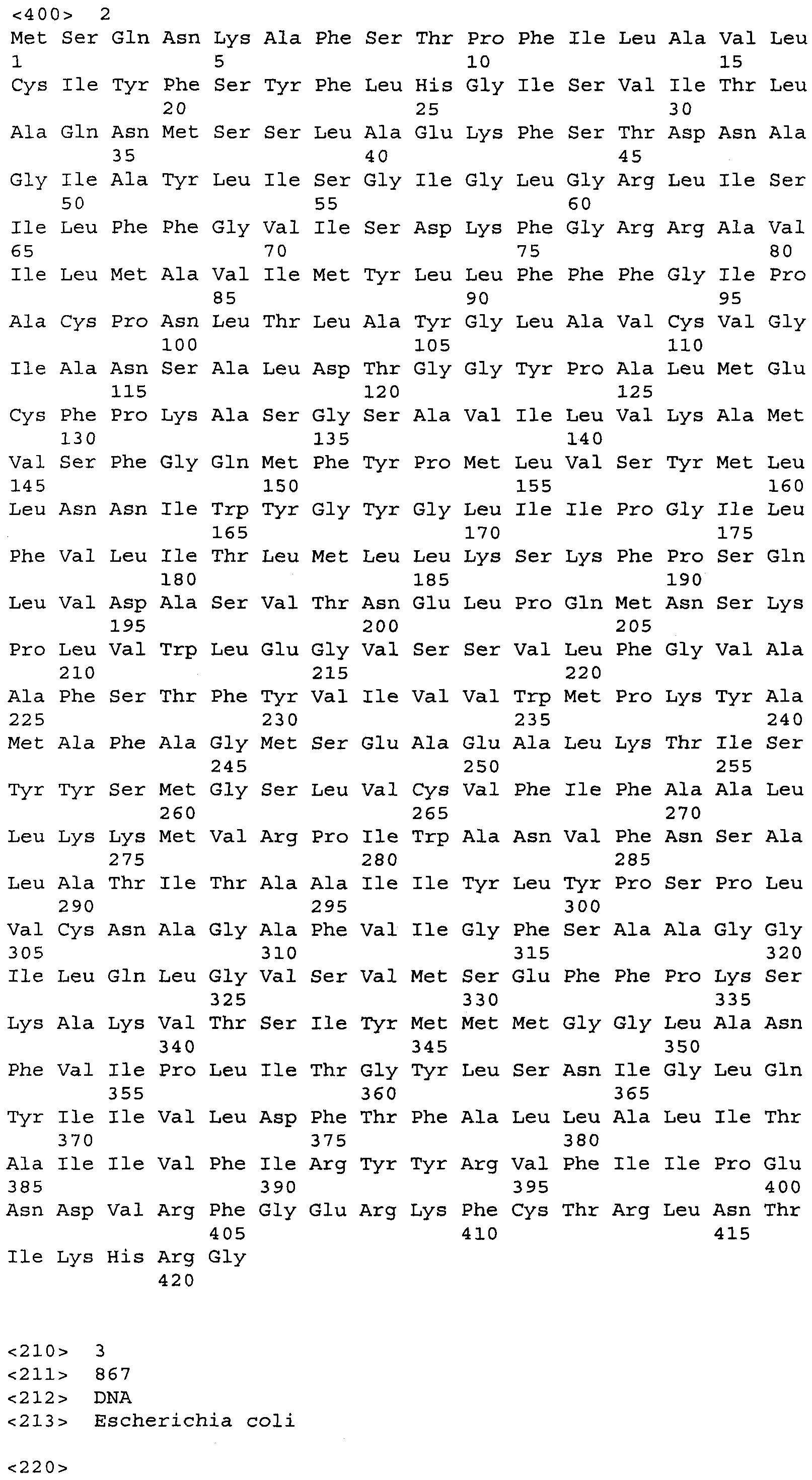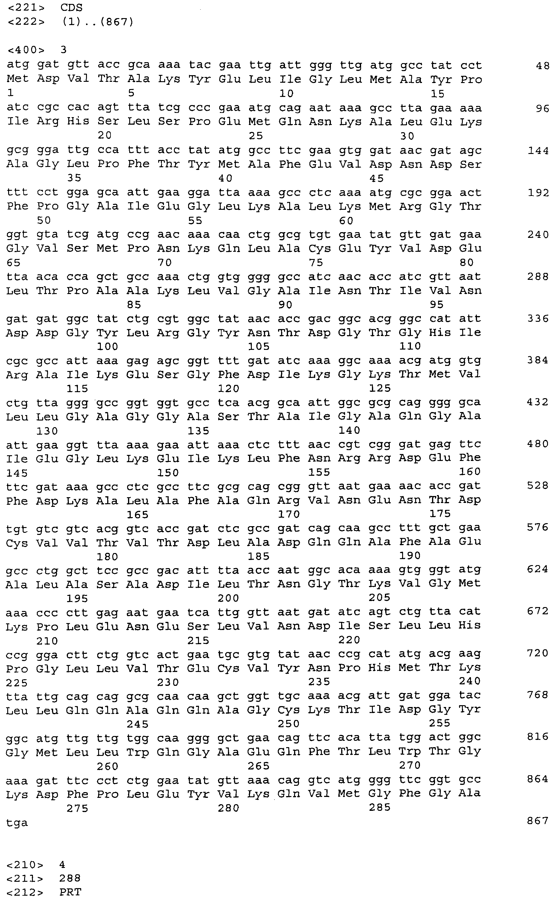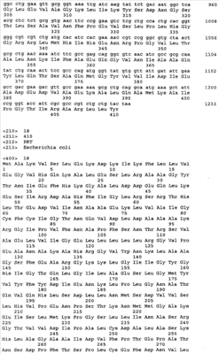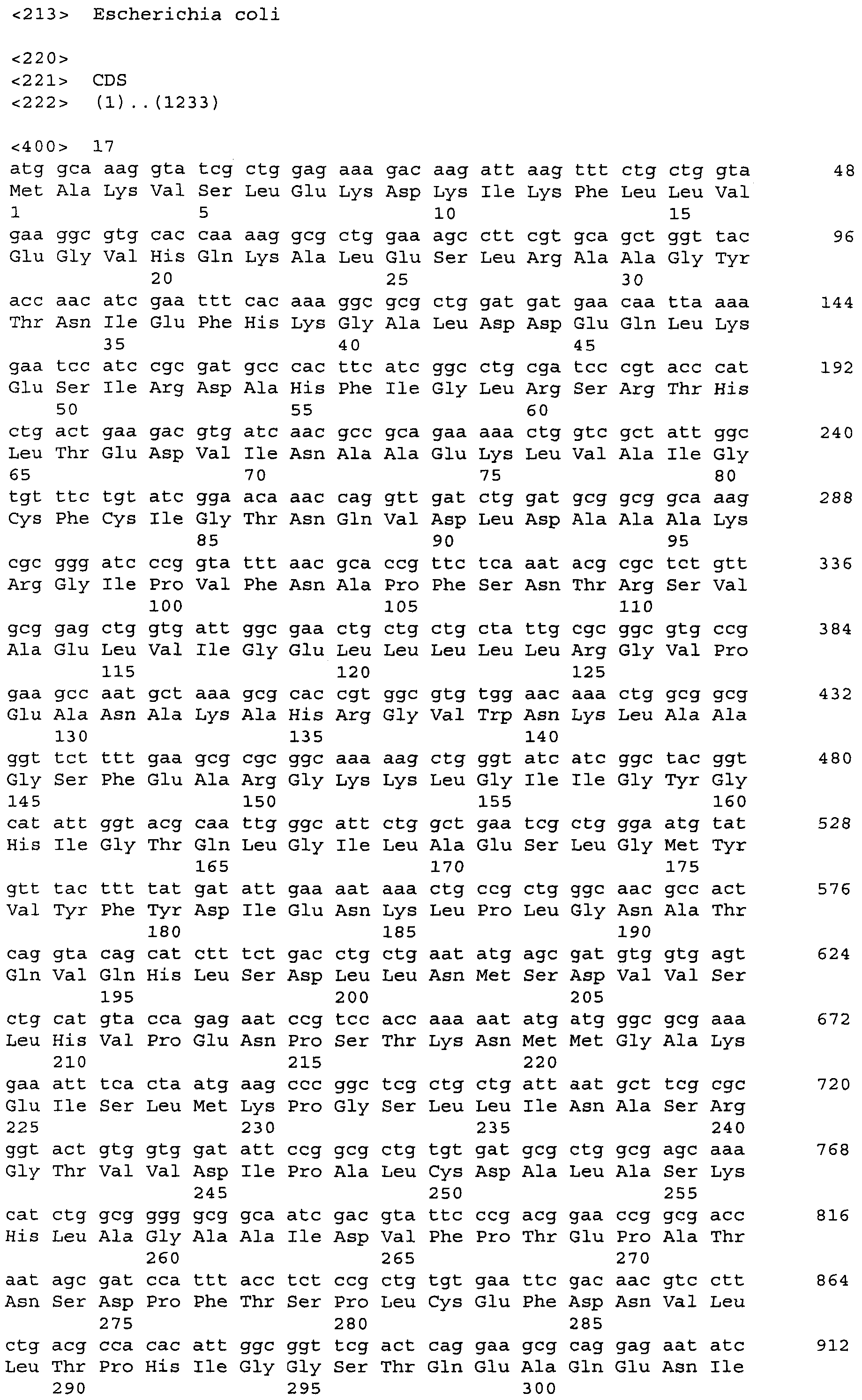 Для увеличения продукции ароматических аминокислот в бактерии может быть ослаблен биосинтез других аминокислот, иных чем целевая ароматическая аминокислота. Например, когда целевая аминокислота- L-триптофан может быть ослаблен биосинтез L-фенилаланина и/или L-тирозина (US 4,371,614). Кроме того, 3-дезокси-D-арабиногептулозонат-7-фосфатсинтетаза (DS), кодируемая генами aroF или aroG, подвержена ингибированию по типу обратной связи ароматическими аминокислотами. Следовательно, бактерия может быть модифицирована таким образом, чтобы содержать мутантную DS, не подверженную ингибированию по типу обратной связи. Такая мутантная DS может быть получена, например, заменой в aroF L-аспарагановой кислоты в положении 147 или L-серина в положении 181 на другую аминокислоту. В случае aroG мутантная DS может быть получена, например, заменой L-аспарагиновой кислоты в положении 146, L-метионина в положении 147, L-пролина в положении 150 или L-аланина в положении 202 на другую аминокислоту или заменой L-метионина в положении 157 и L-аланина в положении 219 на другую аминокислоту. Бактерия – продуцент ароматической L-аминокислоты может быть получена введением в бактерию мутантного гена, кодирующего такую матантную DS (EP 0488424). В особенности предпочтителен мутантный ген aroG (aroG4), в котором L-пролин в положении 150 заменен на L-лейцин. Нуклеотидные последовательности гена aroG дикого типа и аминокислотная последовательность DS, кодируемой геном aroG, приведены в Перечне последовательностей (SEQ ID NO: 19 и SEQ ID NO: 20 соответственно).