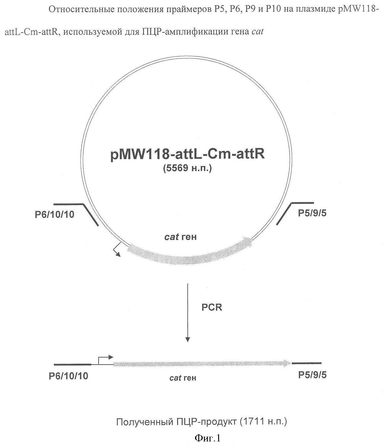 На Фиг.1 изображены относительные положения праймеров Р5/9/5 и Р6/10/10 на плазмиде pMW118-attL-Cm-attR, используемой для ПЦР-амплификации гена cat.