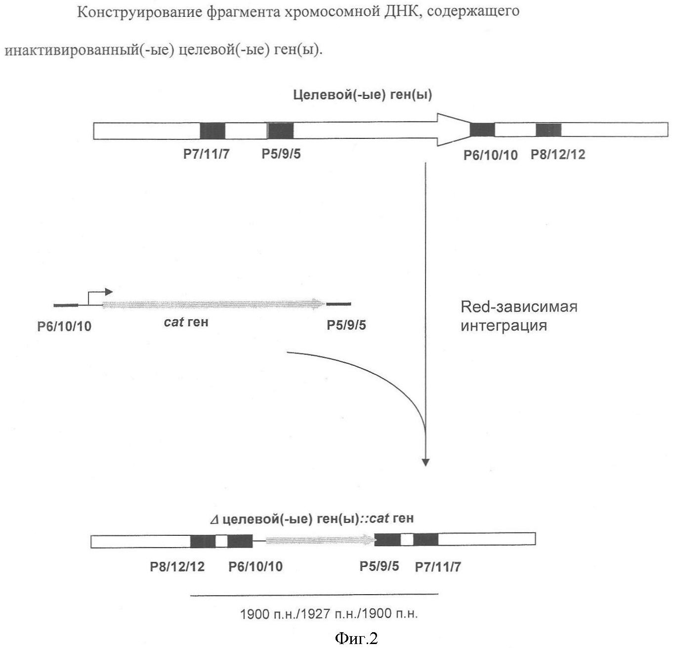 На Фиг.2 изображено конструирование фрагмента хромосомной ДНК, содержащего инактивированный(-ые) целевой(-ые) ген(-ы).