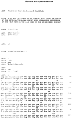 Кроме того, ген ydiN и ген ydiN могут быть вариантами, которые гибридизуются в жестких условиях с нуклеотидными последовательностями, приведенными в Перечне последовательностей под номерами 1 (SEQ ID No: 1) и 3 (SEQ ID No: 3), или с зондом, который может быть синтезирован на основе указанной нуклеотидной последовательности. «Жесткие условия» включают такие условия, при которых специфические гибриды, например гибриды с гомологией не менее 60%, предпочтительно не менее 70%, более предпочтительно не менее 80%, еще более предпочтительно не менее 90% и наиболее предпочтительно не менее 95%, образуются, а неспецифические гибриды, например гибриды с меньшей гомологией, чем указано выше, – не образуются. Практическим примером жестких условий является однократная отмывка, предпочтительно двух- или трехкратная, при концентрации солей 1×SSC, 0.1% SDS, предпочтительно 0.1×SSC, 0.1% SDS, при 60°С. Продолжительность отмывки зависит от типа используемой для блоттинга мембраны и, как правило, такова, как рекомендовано производителем. Например, рекомендуемая продолжительность отмывки для нейлоновой мембраны Hybond N+(Amersham) при строгих условиях – 15 минут. Предпочтительна двух-, трехкратная отмывка. Длина зонда может быть выбрана в зависимости от условий гибридизации, обычно от 100 н.п. до 1 т.н.п.