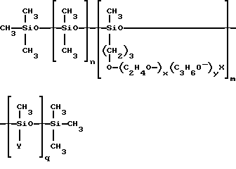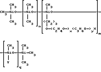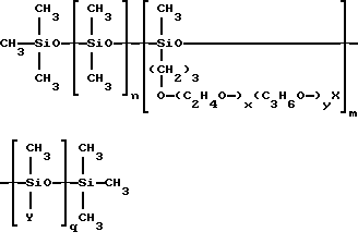 (57) Реферат: Изобретение относится к композиции, обладающей повышенной активностью против зубного налета и зубного камня. Она может быть использована для чистки зубов и зубных протезов. Композиция выполнена в виде зубной пасты, порошка, жидкого средства, жидкости для полоскания рта, очищающего средства для чистки зубных протезов, жевательной резинки или леденца. Она содержит один или несколько компонентов, выбранных из абразивов, связывающих веществ, увлажнителей, поверхностно-активных веществ, источников фторид-ионов, средств против образования зубного камня и подслащивателей. Композиция обязательно содержит диметиконовый сополиол, выбранный из алкил- и алкоксидиметиконовых сополиолов формулы ![]() где X выбран из водорода, алкильной, алкоксильной и ацильной групп, имеющих примерно 1 – 16 углеродных атомов, Y выбран из алкильной и алкоксильной групп, имеющих примерно 8 – 22 углеродных атомов, n составляет примерно 0 – 200, m составляет примерно 1 – 40, q составляет примерно 1 – 100, молекулярная масса остатка (C2H4O-)x (C3H6O-)yX составляет примерно 50 – 2000 и x и y таковы, что массовое соотношение оксиэтилен : оксипропилен составляет примерно от 100 : 0 до 0 : 100. Заявлено применение диметиконового сополиола приведенной выше структурной формулы в качестве средства против зубного налета в составе оральной композиции, которая может быть использована для очистки зубных протезов. Композиция обладает хорошими физическими характеристиками работоспособности при использовании, создает ощущение свежести во рту. 2 с. и 7 з.п.ф-лы, 2 табл. Изобретение относится к оральным композициям, таким как зубные пасты, зубные порошки, жидкие средства для чистки зубов, жидкости для полоскания рта, очищающие средства для очистки зубных протезов, жевательные резинки, леденцы и тому подобное. В частности, изобретение касается оральных композиций, обладающих повышенной активностью против зубного налета в сочетании с превосходными очищающим действием, физическими характеристиками и характеристиками работоспособности при использовании. Когда микробы закрепляются на тонкой белковой пленке на поверхности зубов, образуется зубной налет. Закрепившиеся микробы метаболизируют составляющие пищи и, размножаясь, накапливаются с образованием липкого отложения, известного как зубной налет. Налет обычно состоит из микробов, бактериальных конечных продуктов, таких как полисахариды, неорганических солей и белков слюны. Микробы зубного налета ферментируют карбогидраты пищи в органические кислоты, которые деминерализуют эмаль, что приводит к кариозному распаду зуба. Зубной камень – это, в сущности, зубной налет, минерализованный такими солями, как фосфаты кальция. При развитии и затвердевании зубного камня он заметно окрашивается в результате адсорбции хромагенов пищи. В дополнение к непривлекательному виду отложения зубного камня на линии десен способствуют возникновению гингивита и пародонтоза. Кроме гигиенических проблем и проблем здоровья, возникающих в результате наличия зубного налета, как показали исследования, основным источником неприятного запаха изо рта является задерживание с последующим разложением мертвых клеток, непрерывно отторгаемых нормальным, здоровым ртом. Современные препараты для ухода за зубами и зубными протезами обычно содержат средства 