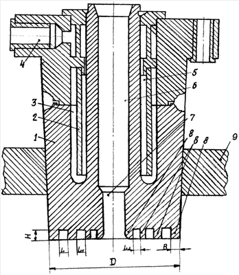Вода на охлаждение корпуса 1 подается через патрубок 4 в наружный канал 3 между корпусом 1 и разделительной перегородкой 2. Проходя через канал 3, вода охлаждает наиболее термически напряженную торцевую часть фурмы, попадает во внутренний канал 5 и уходит через патрубок отработанной воды (не показан).